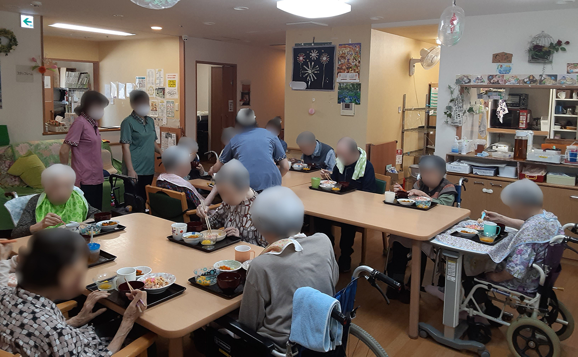 昼食はフロア合同でテーブルを囲い、彩り豊かなちらし寿司を召し上がっていただき、そのあとは全員で 『カラオケ大会 敬老編』にてカラオケバトル??!!