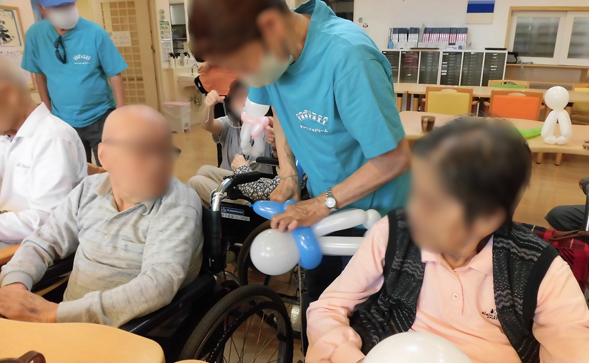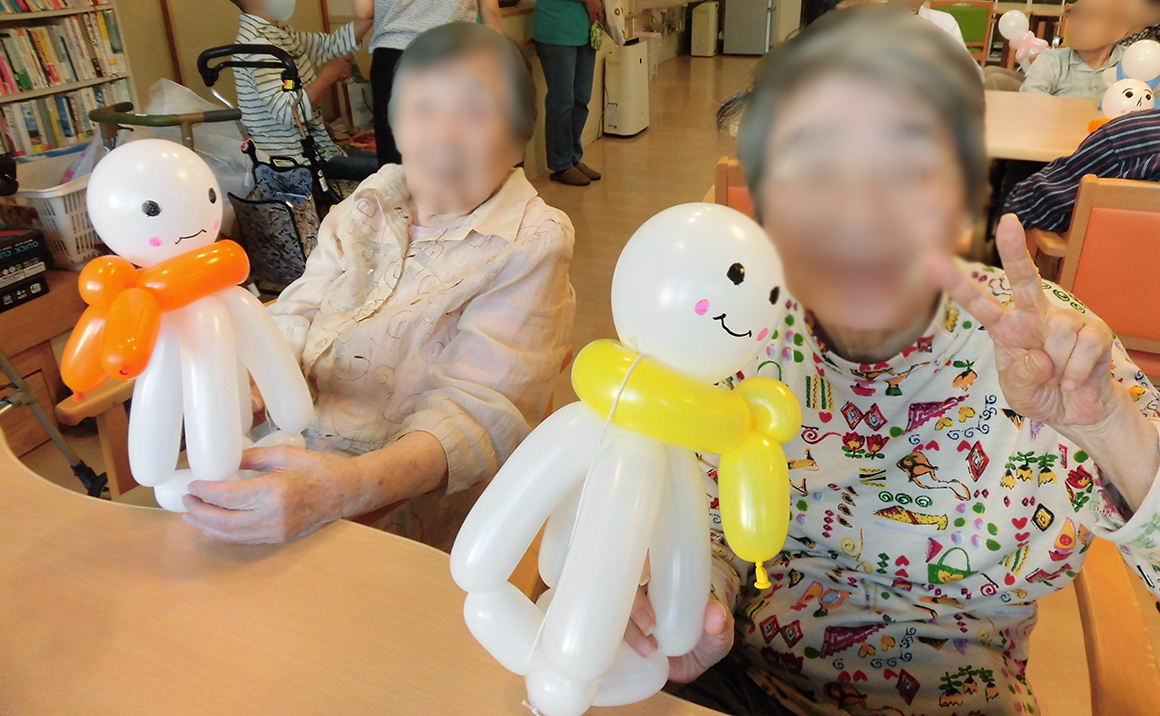 プレザンメゾン此花高見では、本日のレクリエーションはボランティア『チャイルド★ドリーム』さんによるバルーンアート『 てるてる坊主』づくりでした。 てるてる坊主の下の部分は『チャイルド★ドリーム』さんで下準備してきてくださり、ご入居者様には頭とマフラーを風船で作って頂きました。 皆様方バルーンアートづくりに夢中になられ最後にお顔を書いて頂き個性あふれる『てるてる坊主』が完成いたしました。 今回のバルーンアートはとても皆様方に好評であり楽しんでいただくことが出来ました。