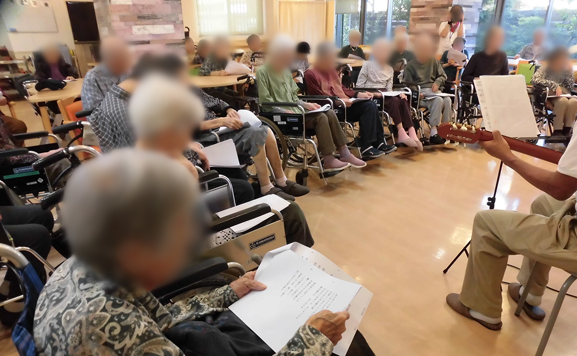プレザンメゾン此花高見では本日ボランティアグループ『たき火🔥』による定期ウクレレ演奏会♬を開催いたしました。 今回の演奏会は「湯の町エレジー」のギターの弾き語りもあり、ご入居者様達はうっとりと聞き入っておられ、 皆様方の歌声とウクレレの音色が施設に響き渡り、とても楽しい時間を過ごすことができました。