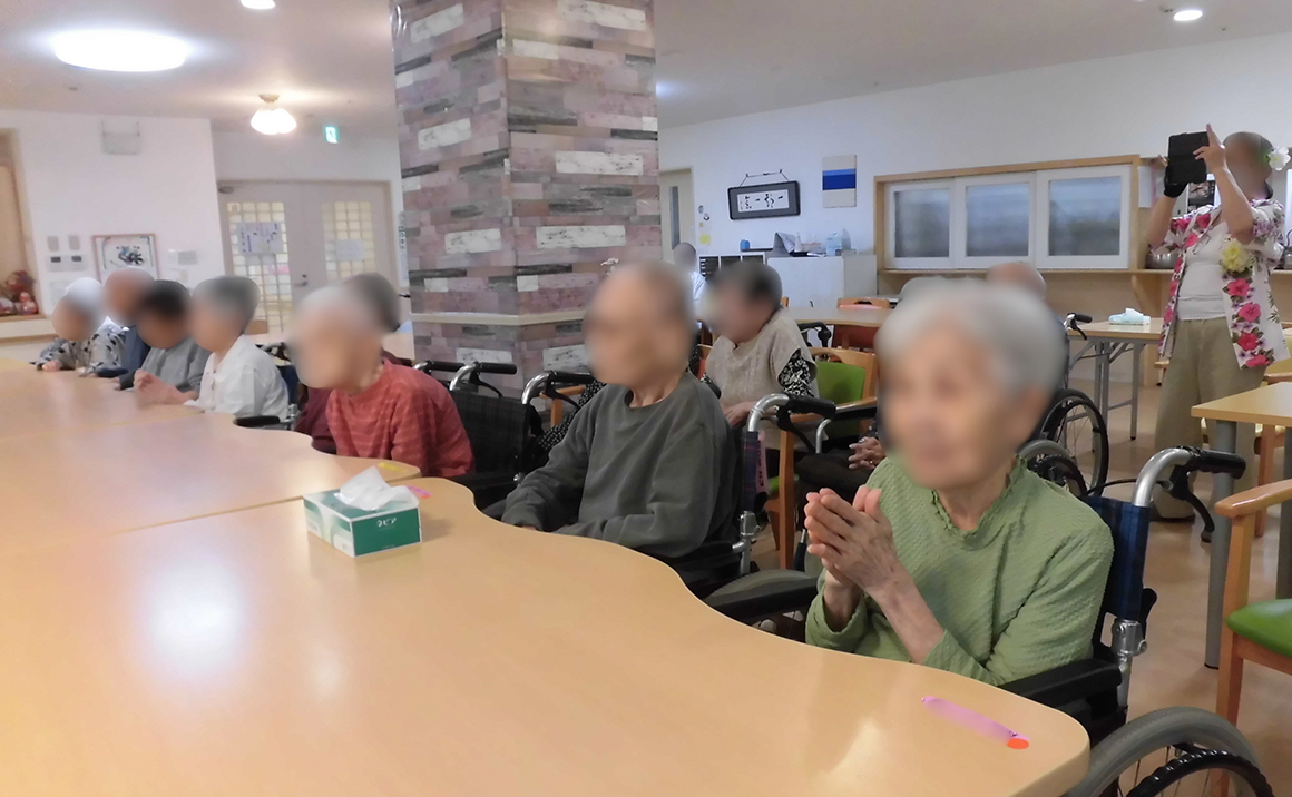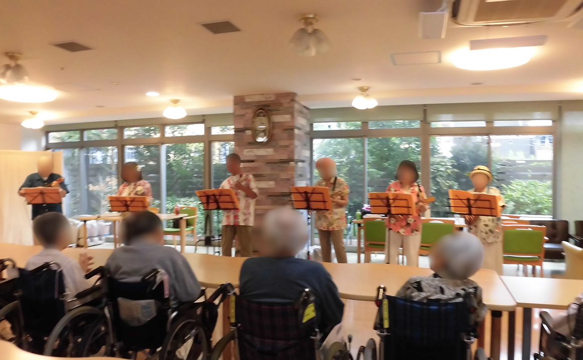 プレザンメゾン此花高見では本日、ホアロハグループさんによる定期ウクレレ演奏会♬を開催いたしました。 演奏曲8曲+アンコール曲2曲で演奏が始まると拍手と、手拍子で施設内は歌声とウクレレの音色で盛大に盛り上がりました。 ご入居者様も毎月のウクレレ演奏会♬を楽しみにしておられとても楽しい時間を過ごすことが出来ました。