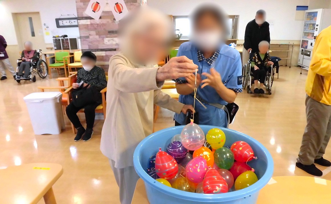本日プレザンメゾン此花高見では、今年最大のイベント『秋祭り』を開催いたしました。 今回はご家族様をお迎えしてのイベントでもあり、ご入居者様に楽しんでいただけるようゲームや屋台の出し物も沢山ご用意させて頂きました。 ヨーヨー釣りのヨーヨーはご入居者様に持って帰って頂き、たこ焼き、綿菓子はその場で召し上がって頂きました。 笑い、笑顔が見られたりと楽しい時間を過ごすことができたことにとても嬉しく思っております。