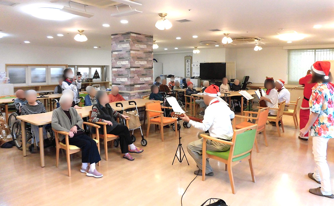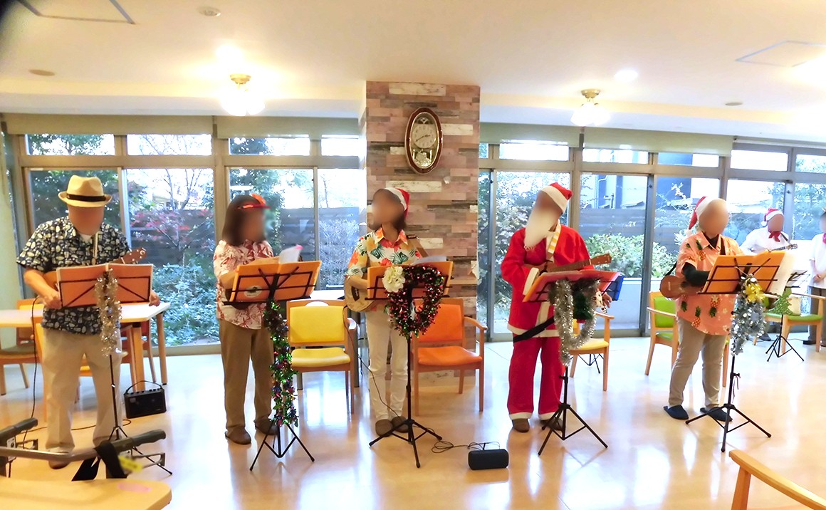 プレザンメゾン此花高見では、本日今年最後の『定期ウクレレ演奏会』を“ ホアロハ”グループさんと“たき火”グループさんと合同でChristmasソングを交えての盛大な演奏会を開催いたしました。 ご入居者様たちも手拍子でリズムをとられ演奏に合わせ合唱されたりととても和やかな雰囲気の中で楽しい時間を過ごすことができました。