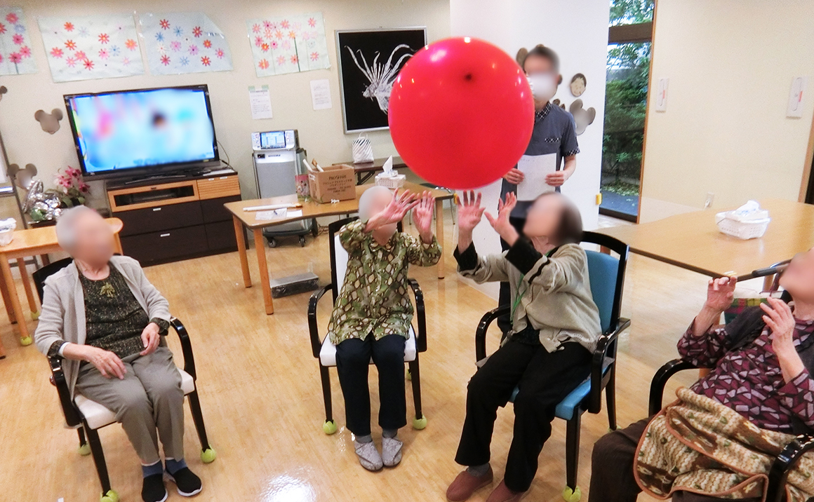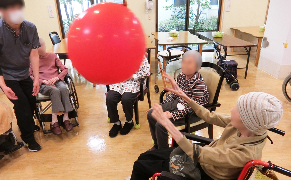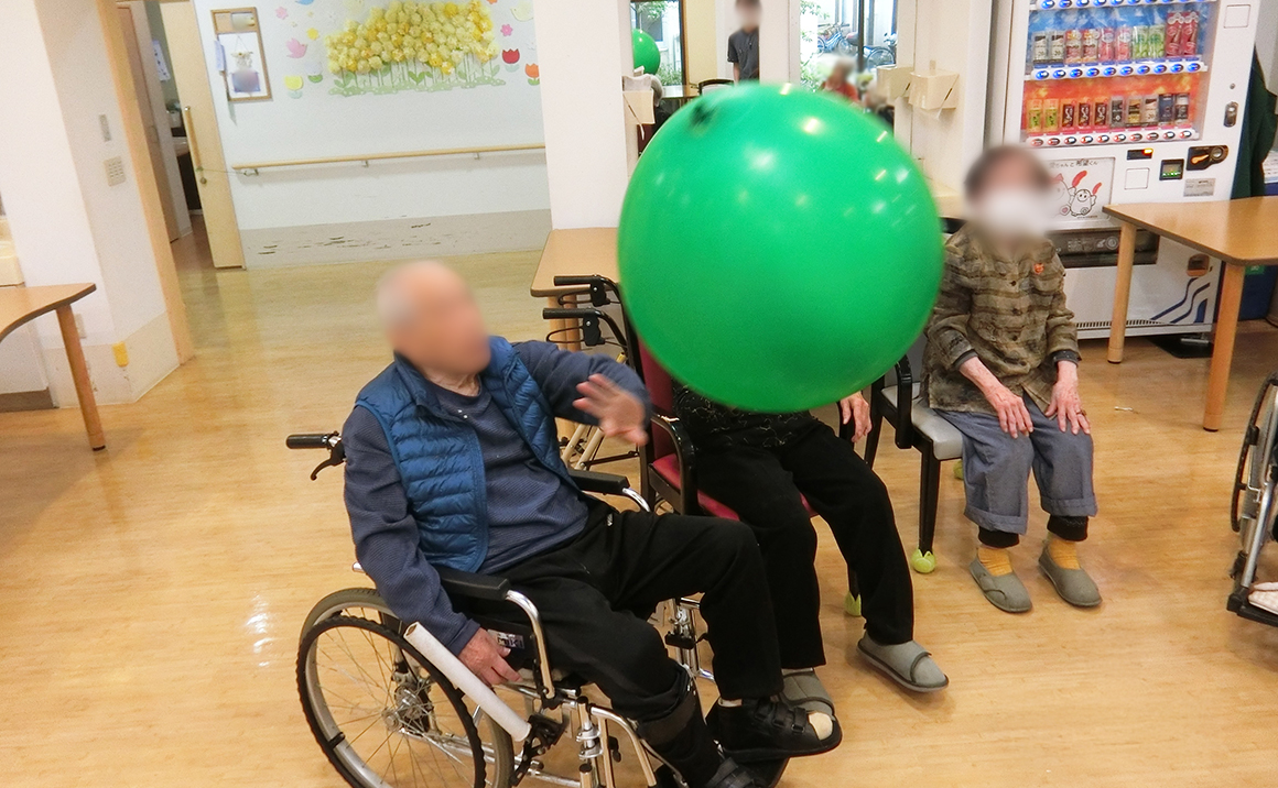 みんなで輪になって、大きなバルーンをバレーボールのようにパスし合います。