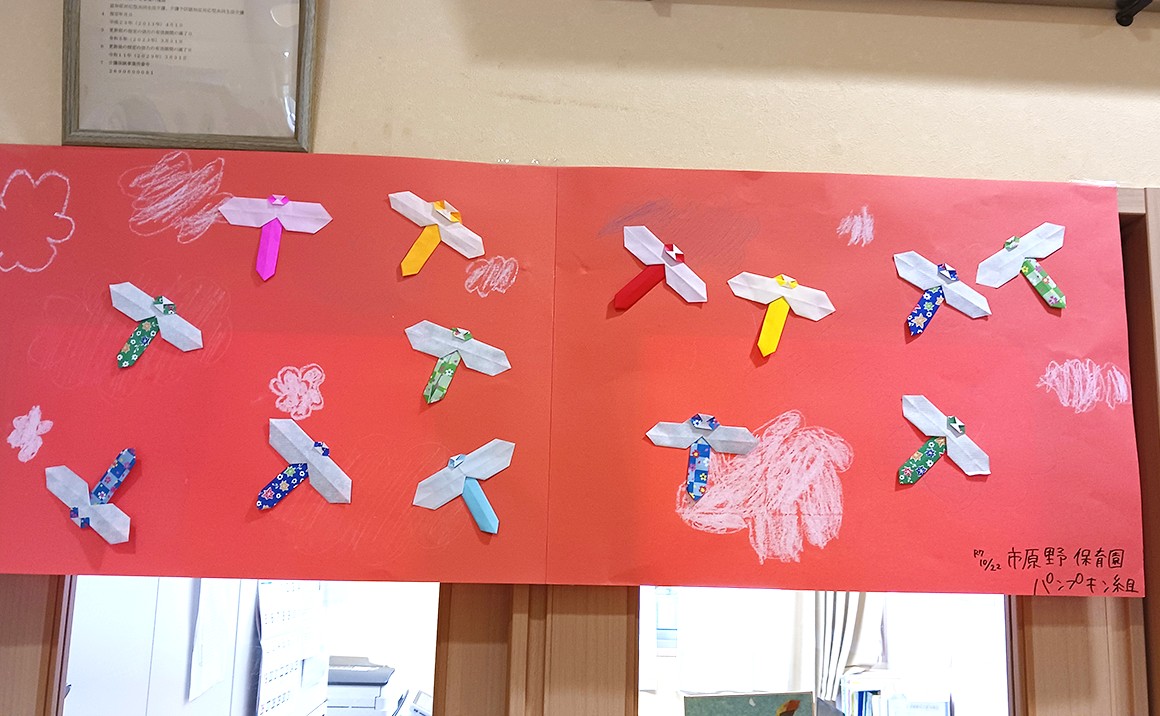 園児が作ってくれたトンボのかわいい、秋らしい作品をいただき、玄関先に飾っています♬