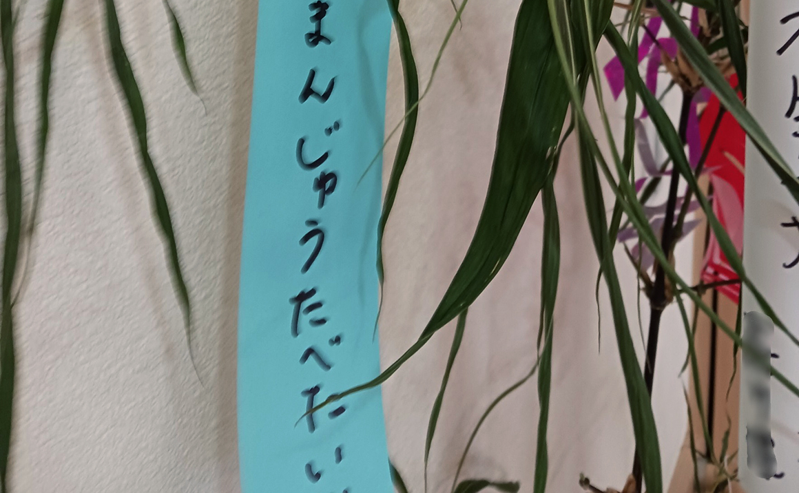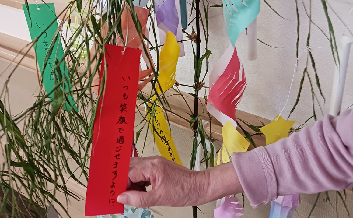 年に一度の七夕祭り。笹の葉(本物)を職員に用意してもらい、願い事を職員・入居者様共に書いていただきました。 ちょっと夏らしいおやつを食べて、七夕の歌を歌い、写真撮影を行いました☆ おやつの写真を忘れていました。。。