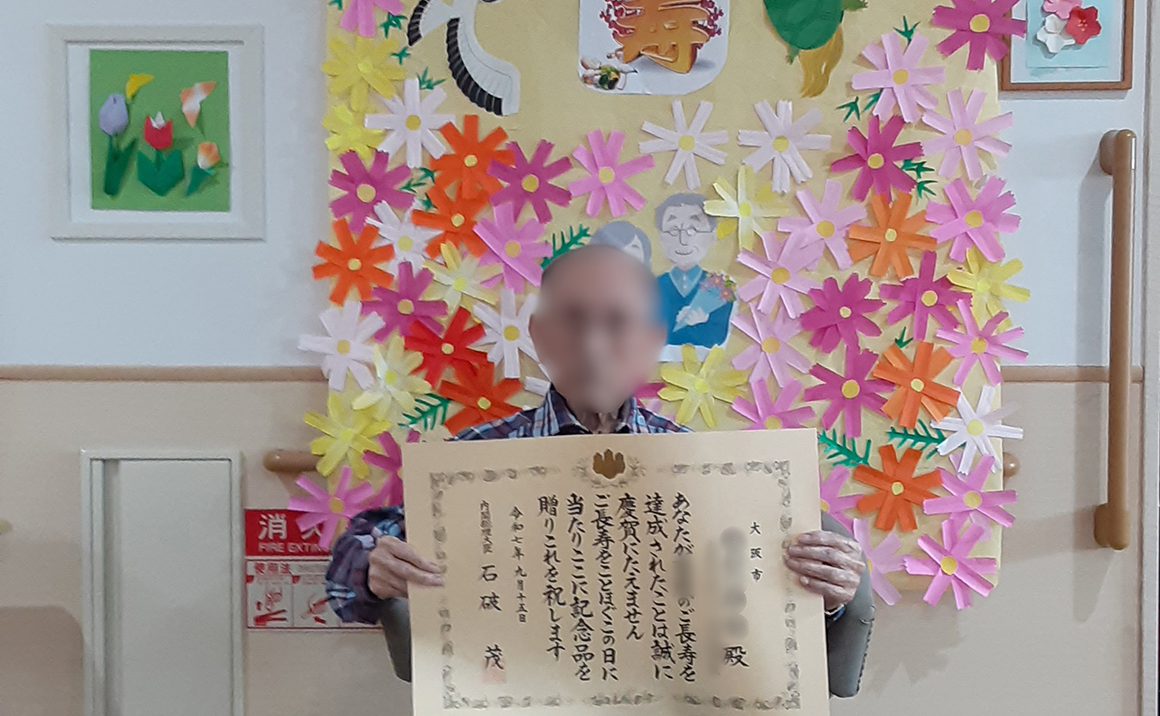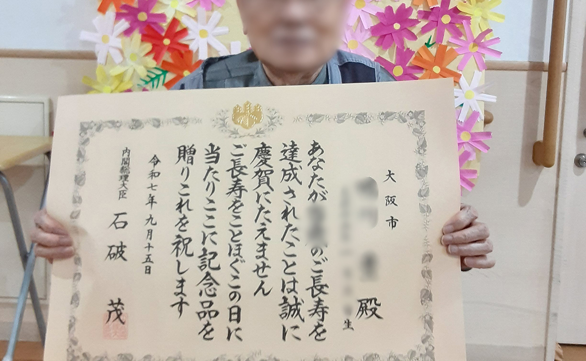 9月16日、100歳のお祝いに大正区役所の職員が訪問されました。 100歳の利用者様お2名には、内閣総理大臣からのお祝い状と記念品の銀杯が贈られました。 表彰状、記念品の銀杯を「ありがとうございます」と受け取られ、周りの利用者様も拍手でお祝いいたしました。 現在は大切に自室に飾っておられます これからも穏やかに健やかに過ごして頂きますよう支援いたします。