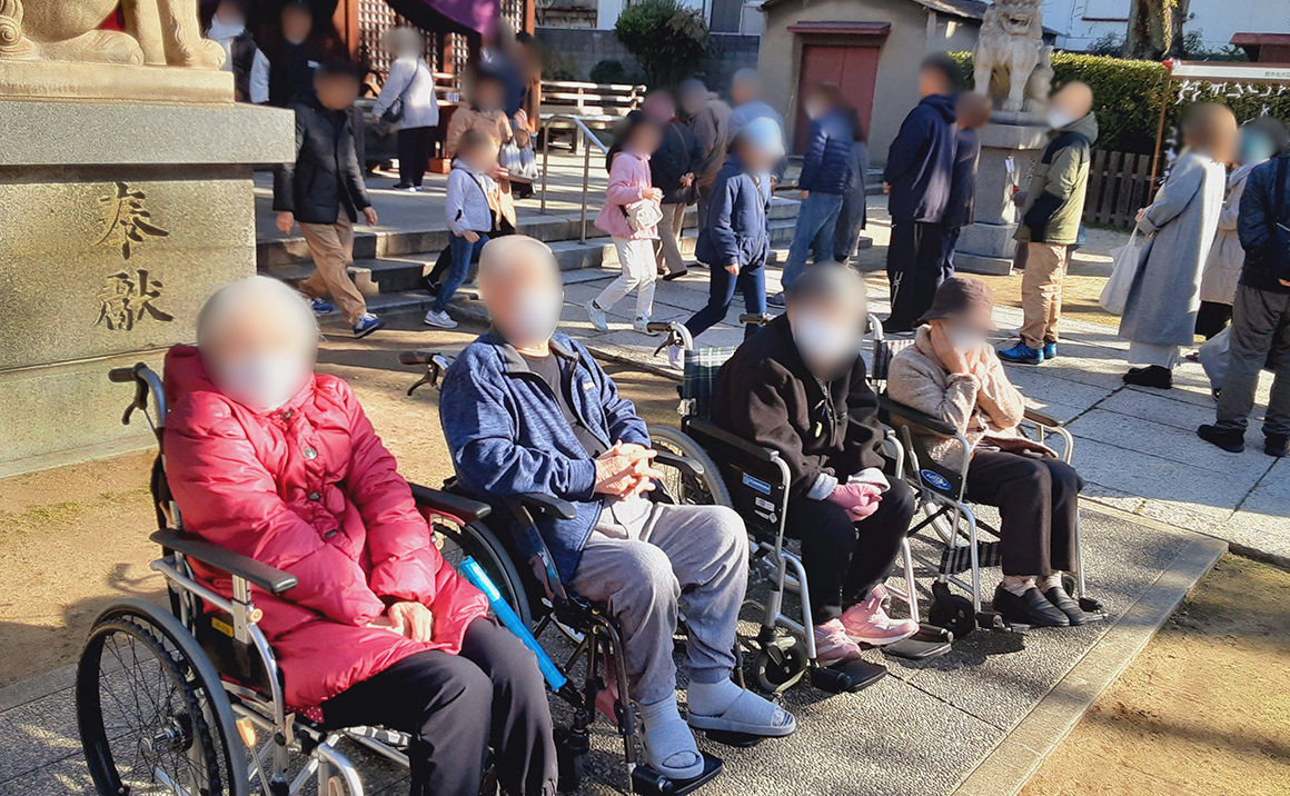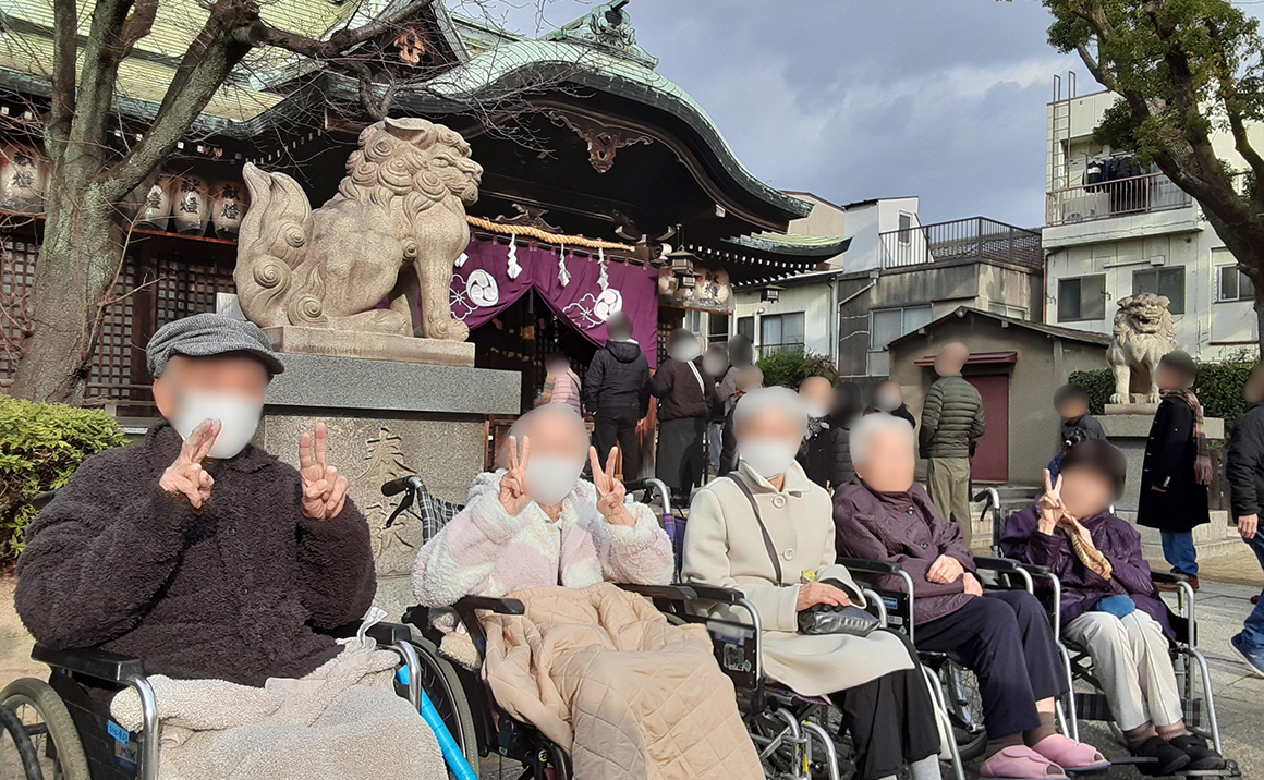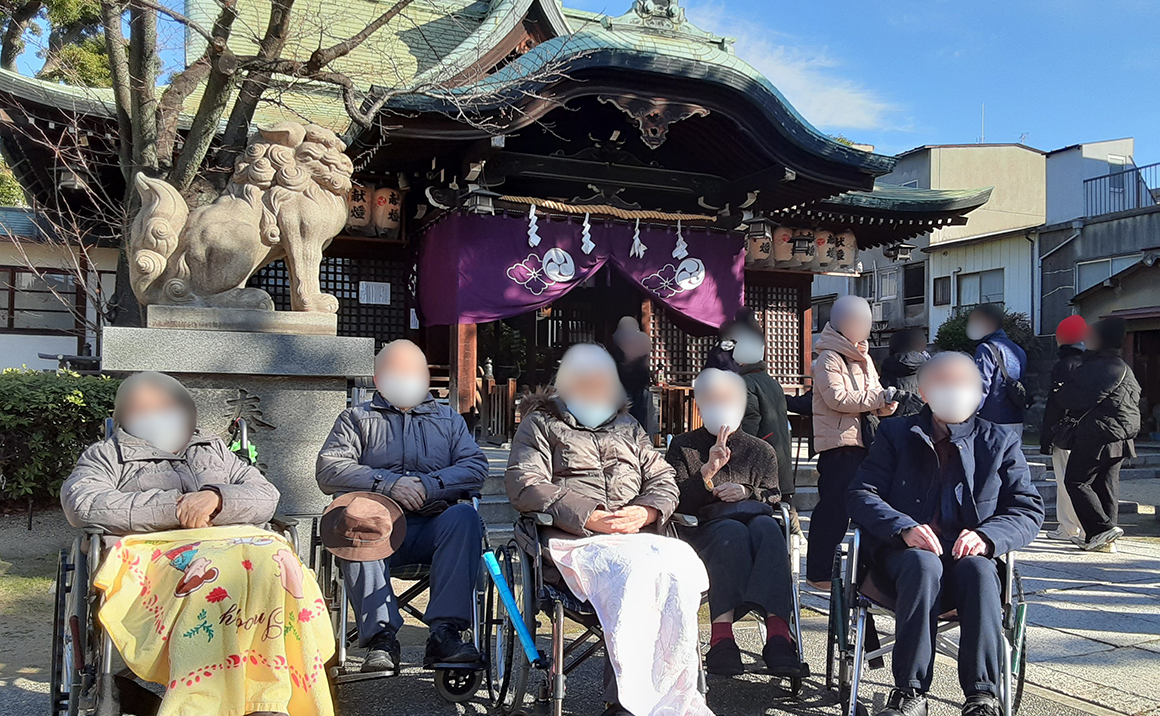 1月1日から3日にかけて近くの泉尾神社に初詣に出かけました⛩️ お天気も良く、新年のご挨拶をしながらゆっくりと参拝することが出来ました(^^) 車椅子のご利用者様は職員が付き添い安全に気を付けながら移動し、境内では一年の健康を願い手を合わせておられました。