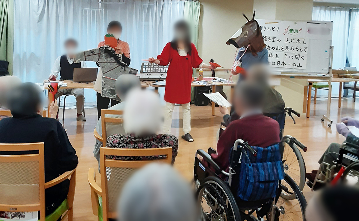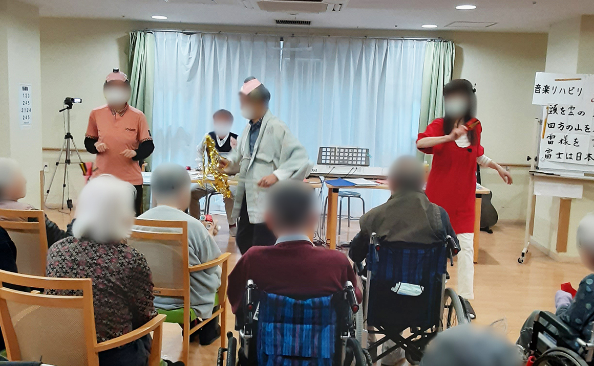 1月18日に音楽リハビリの先生に来ていただき、リラクゼーションや回想法、思考能力の活性化を 目的にイベントを開催しました🎶 先生の楽しいお話と素敵な歌に皆様集中して聴き、一緒に歌い楽しみました(*^_^*) 今年の干支のクイズや思い出、歌、馬の仮装やマツケンサンバの踊りもあり、盛り沢山で楽しい時間を過ごしていただきました♪(´▽`)