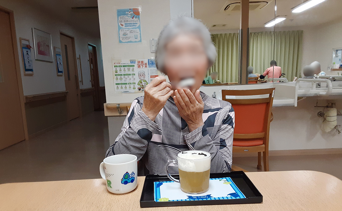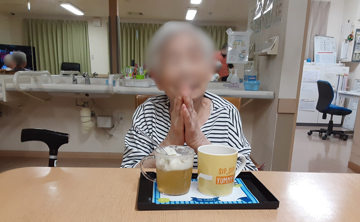 6月ではございますが、真夏のような暑い日が続いております。 連日暑い日が続いているというニュースをテレビで観た入居者様が「こんな暑い日はビール飲みたいなぁ」と仰っていたため、 父の日のレクリエーションで職員手作りのビールに見立てたゼリーをおやつにご用意致しました! ビール風のコップにアップルゼリーと泡を作ってお出しすると、見た目はビールなのにゼリーなことに驚かれながらも皆様に好評で良く召し上がって頂けました♪