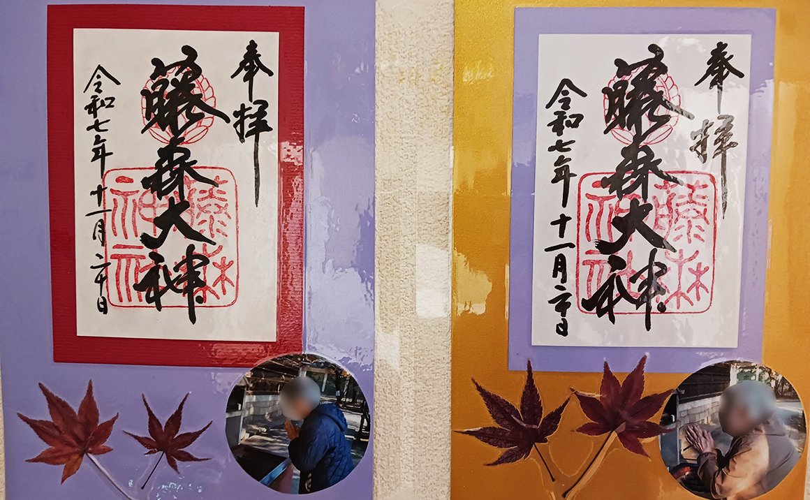 先日気候の良い日に施設の近くにある藤森神社へ参拝に出かけました! 「近所にあったけど来るん久しぶりやわ~」「ええ天気やから気持ちいいね」と喜んで頂けました。 拝受した御朱印は葉と一緒に飾らせて頂いています♪