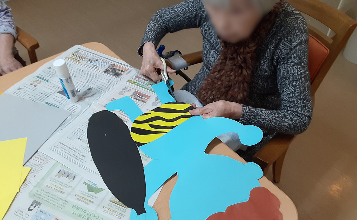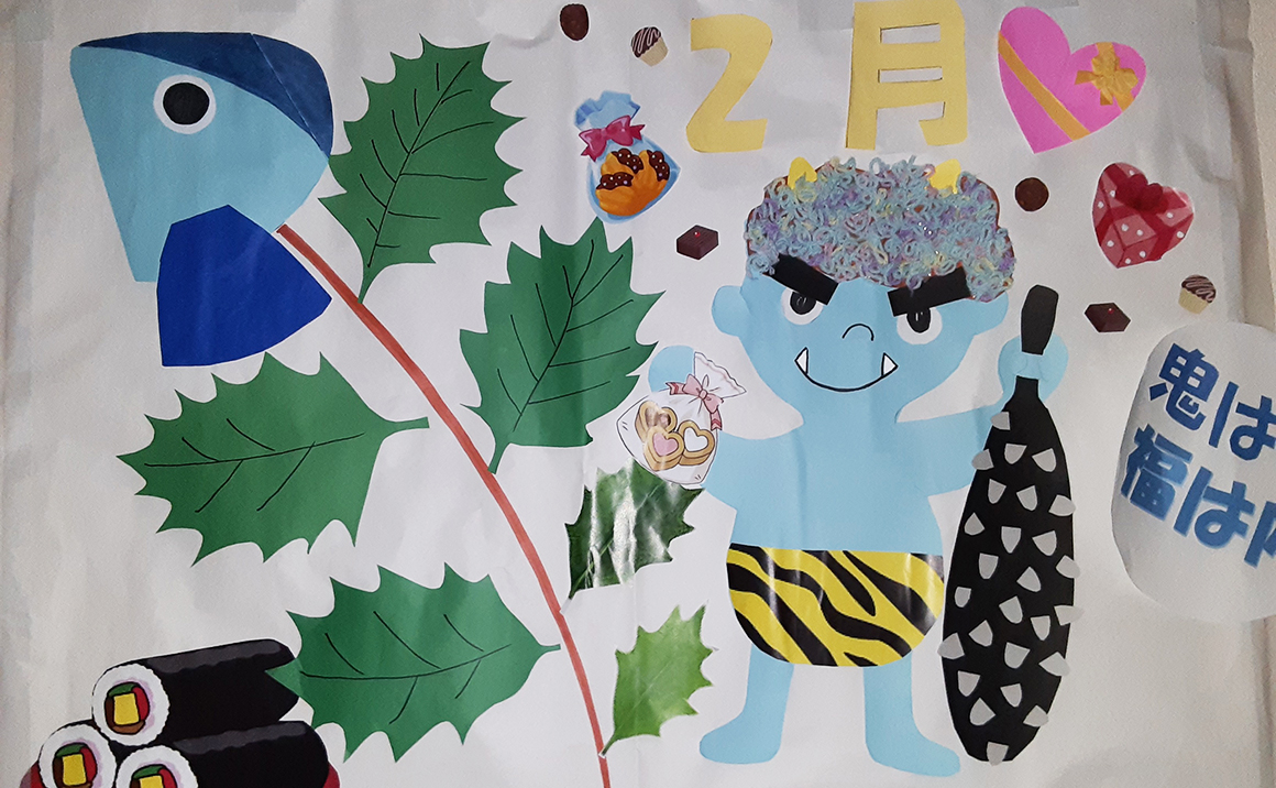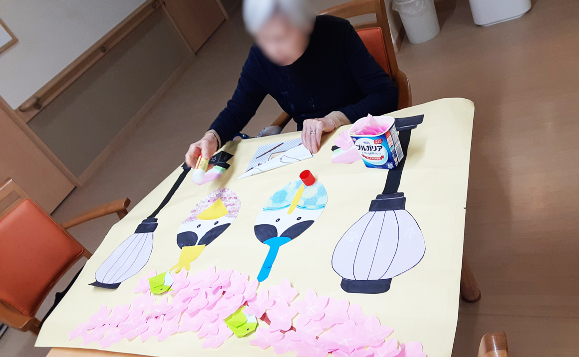 たのしい家伏見深草では入居者様と共に季節の壁画作りをしています。 どんなものを作るか入居者様と相談しながら、切ったり貼ったり入居者様にも出来る部分を担って頂いております。 毎月大作が出来上がるので入居者様も職員も楽しみにしております♪
