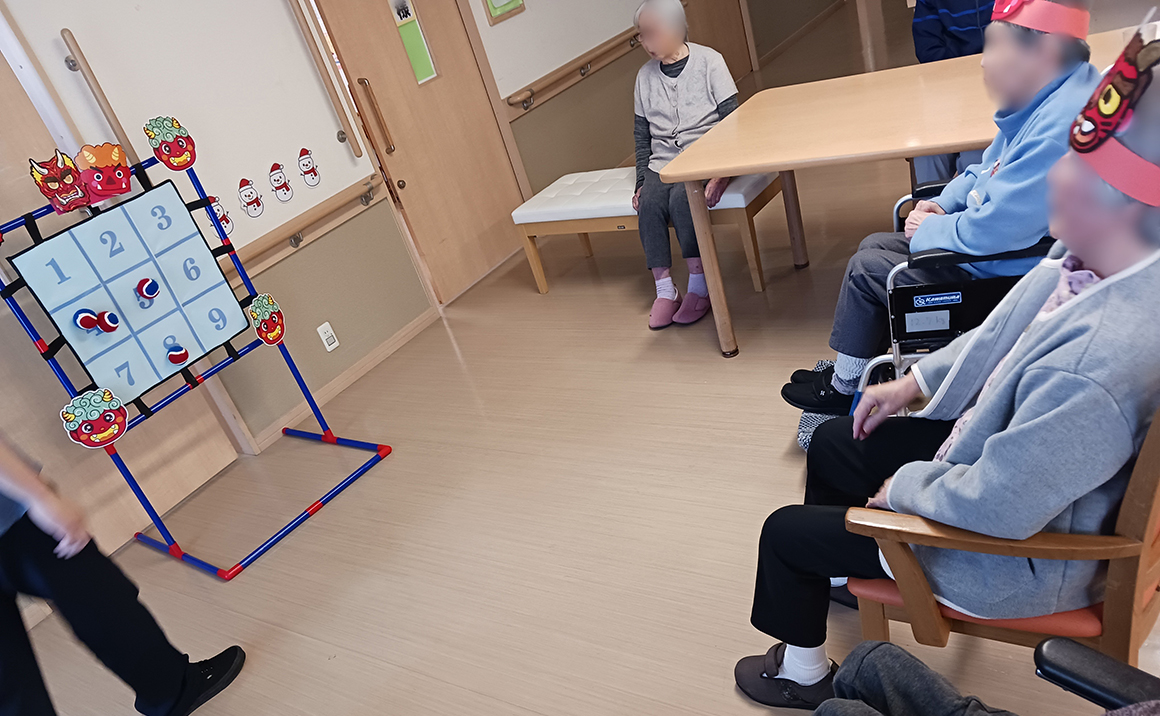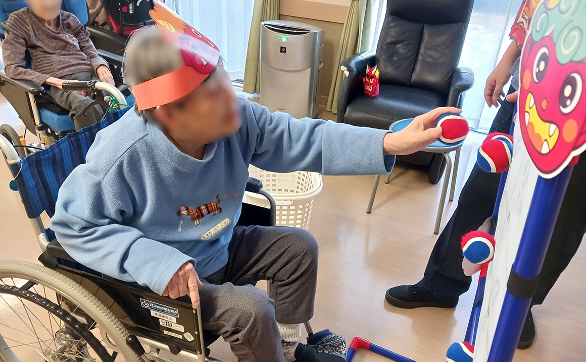 たのしい家伏見深草では季節にちなんだレクリエーションやイベントに取り組んでいます。 2月はやはり節分!ということで皆様で豆まきを模した的あて大会を行いました! 入居者様に合わせて職員が的を近づけたり、遠くしたりすると「そんな遠かったら当たらへんやん!」等と 手厳しい指摘が入居者様から飛びながらも皆様的めがけて力いっぱい投げておられました♪