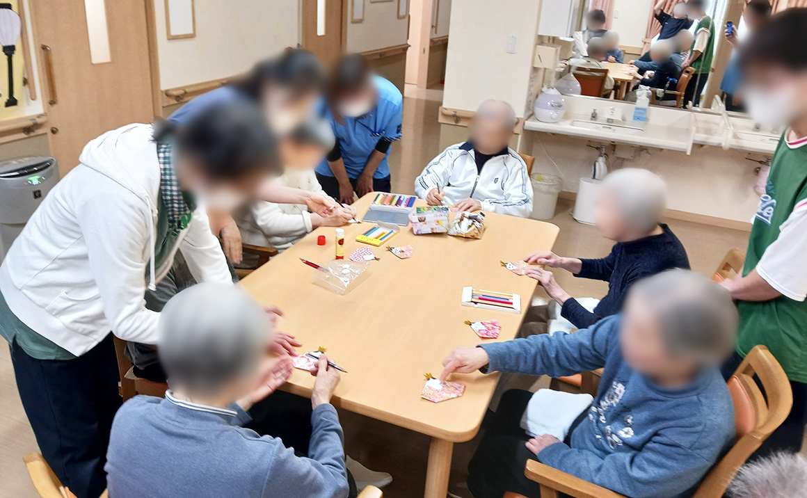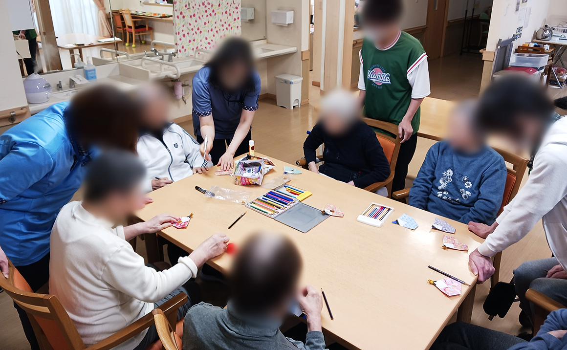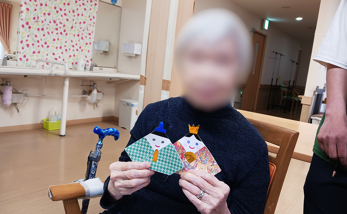たのしい家伏見深草では毎月季節の行事イベントを行っております。 3月といえばひな祭りですね。先日ひな祭りの飾りつけを入居者様と一緒に作りました! 手先の器用な入居者様がパーツを作って下さり、皆様でワイワイ楽しみながら顔を書いてオリジナルのお内裏様とお雛様を作って頂きました♪