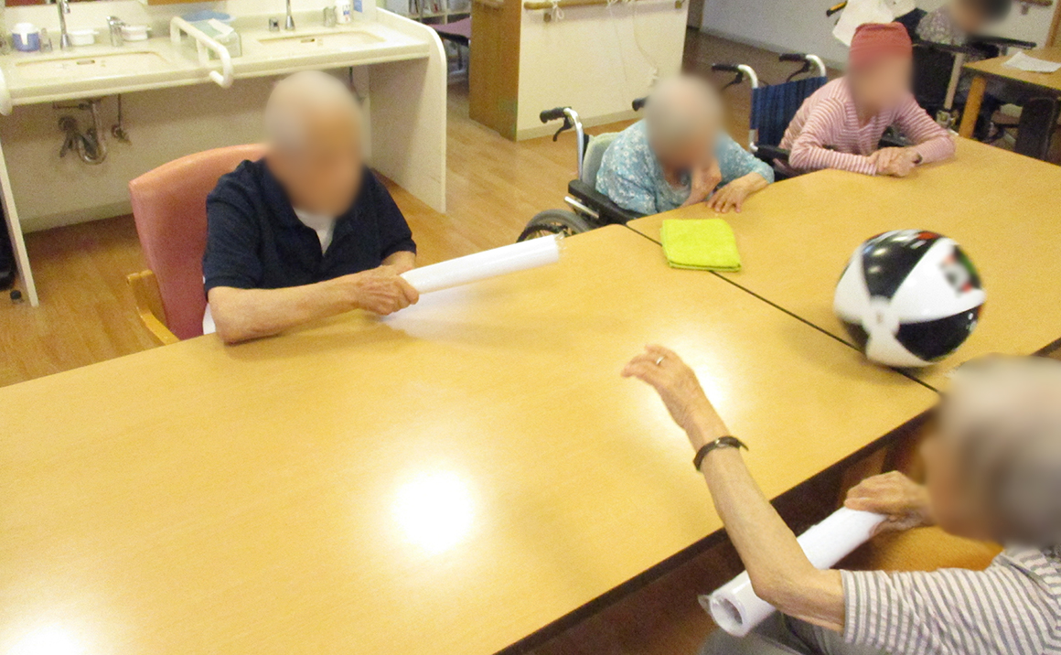 ご利用者様に人に当たっても痛くない棒を持っていただき、ビーチボールを叩きあうと言う単純な物なのですが、これが思いのほか盛り上がったんです。