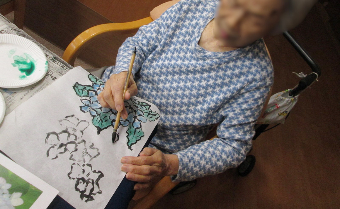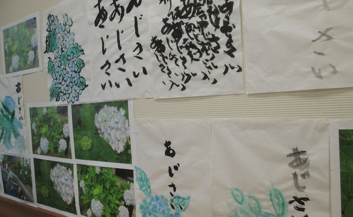 書道で先日見た紫陽花の花も絵具で書いて頂きました。 書道を皆様に勧めると「え~っ書けない書けない」と言われます。 『あじさい』と墨で書いてから、絵具で先日見た紫陽花の絵も書いてもらいましたが 花の写真がないと書けないとの事で写真を渡すと、見ながら真剣に書いてくださいました。