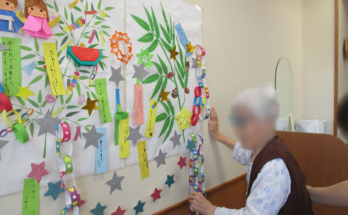 七夕の前に短冊や飾りをスタッフと一緒に作りました。 今年は各フロア、皆様が常に過ごされる食堂の壁に笹の絵を張り出し それぞれの願いが書かれた短冊などの作品を貼り付けて頂きました。