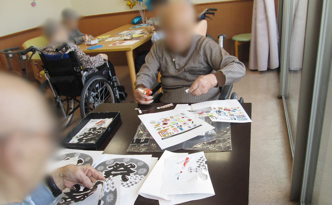 夏祭りに向けてうちわ作りに挑戦しました。 ハサミでイラストをカットして頂きますが 「久しぶりにハサミを持ったけど上手く切れないわ」 「どこを切ればいいの?」 「ここを切ればいいんじゃない」などとお互いアドバイスしながら うちわ作りを楽しまれました。