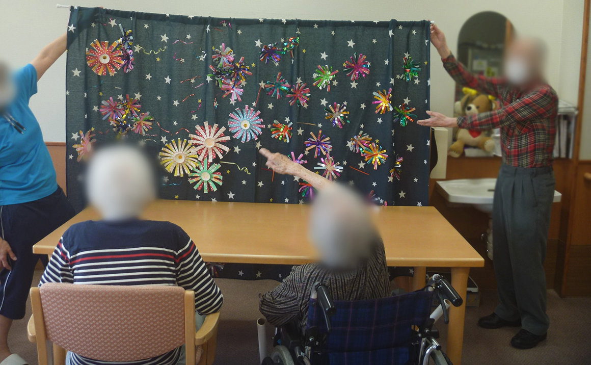 前回、作成中だった花火も沢山出来上がり 皆様と一緒に飾る事も出来ました。