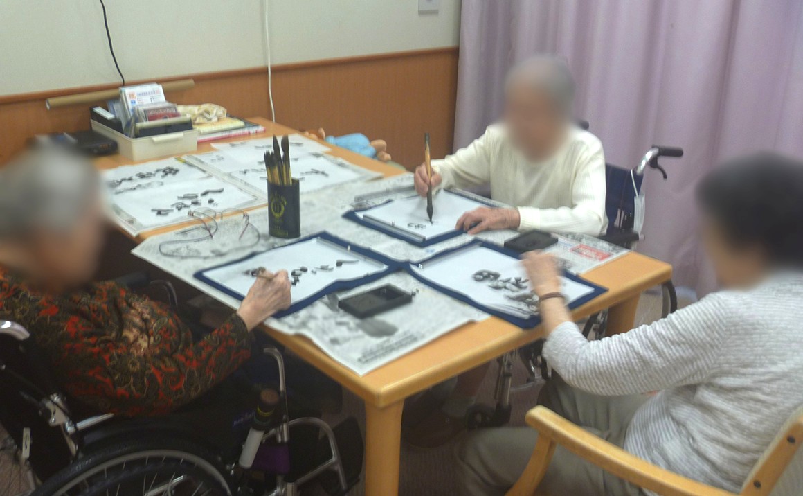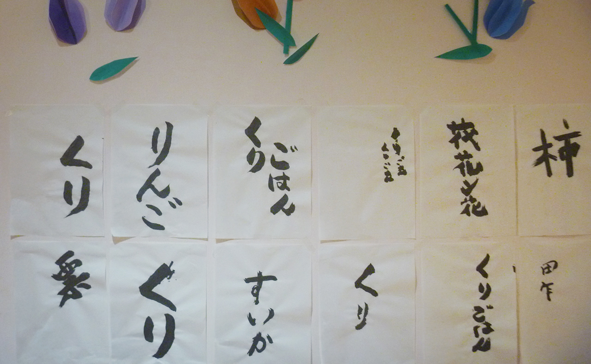 その後、秋にちなんだお題で皆様に思い思いの文字を習字で書いてもらいました。 「上手く書けないわ」と言いながらも、筆を持つ手に力が入っていました。 一筆一筆丁寧に書かれている姿を側で見ているスタッフも思わず 「上手に書けていますよ」と褒めていました。。