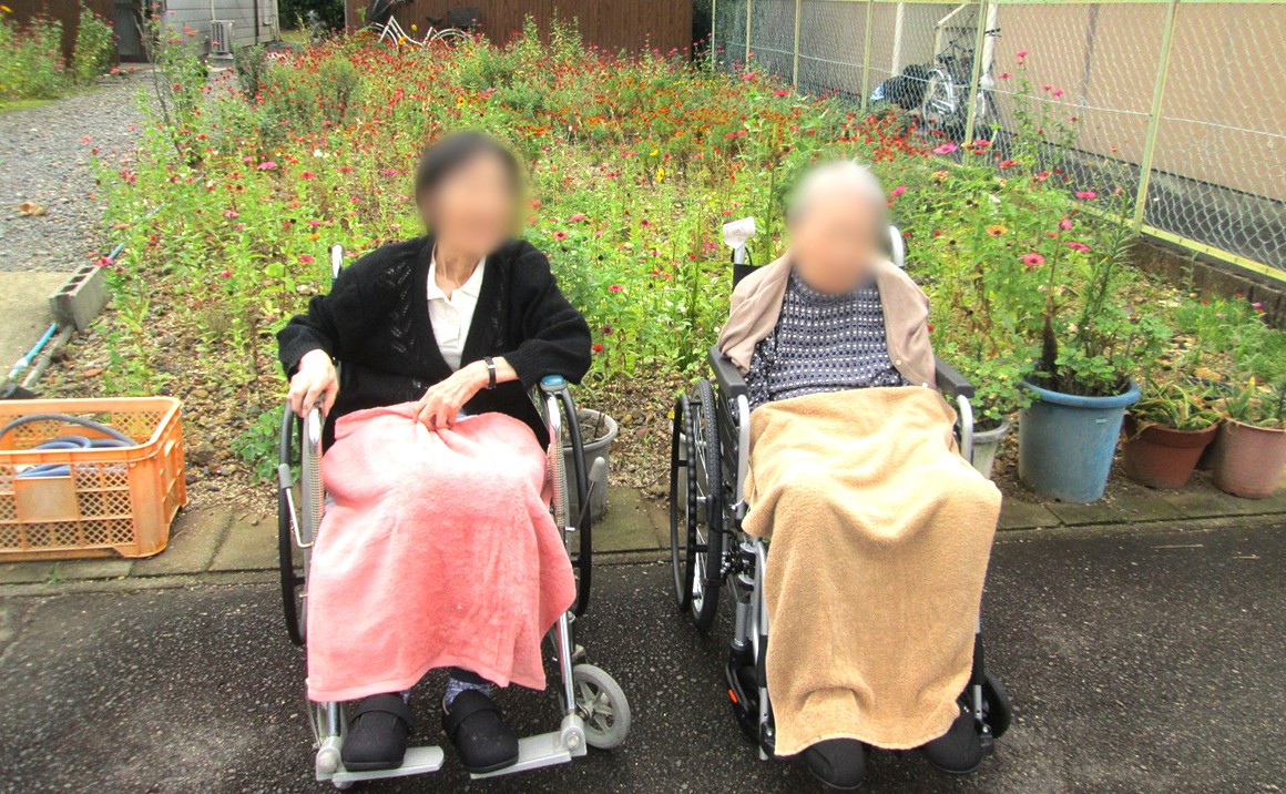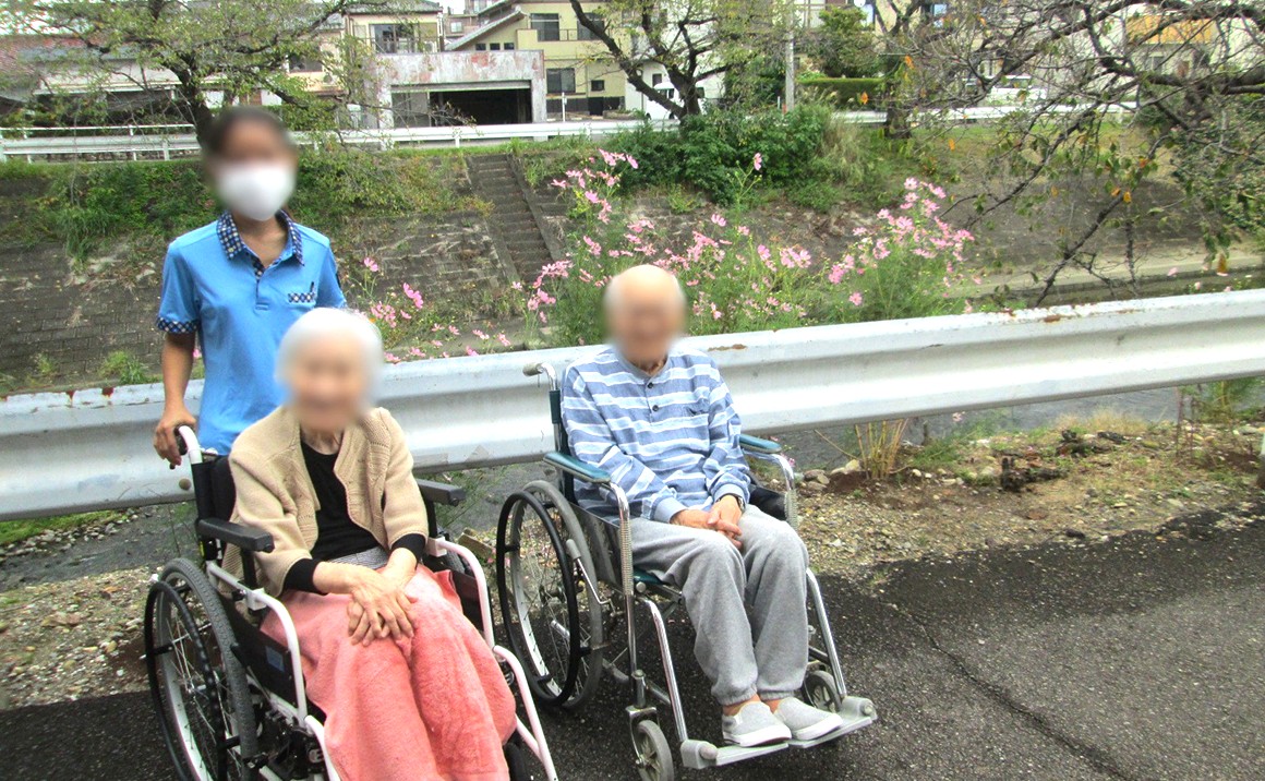 施設の近くの川沿いで柿の実をつけた木を見て「たくさんなっているね」とか コスモスの花を見て「綺麗に咲いているね」などと会話も弾んでいました。 寒くなる前に又、紅葉も見に行きましょうね。