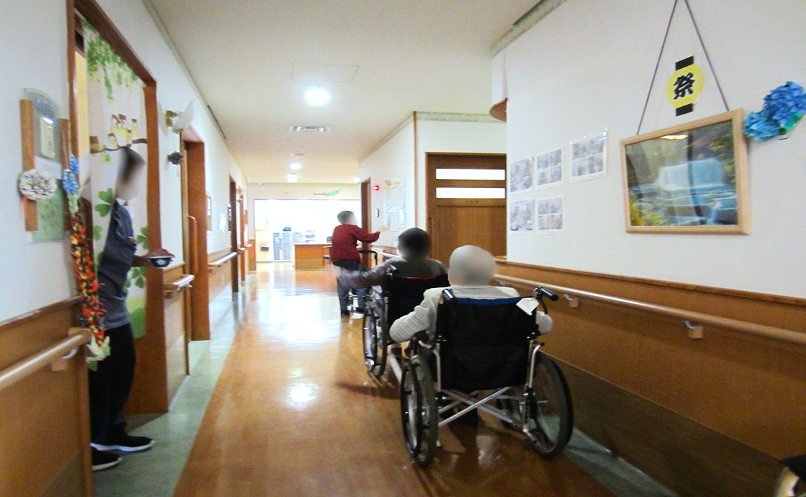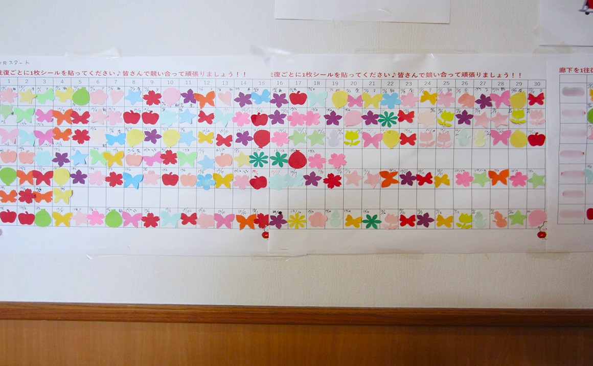 今年の夏はとても暑くて外に出るのもままならず、気分転換を兼ねて 筋力低下防止対策としてスタッフが考えてくれました。 独自のシールを作り、車いす自走や歩行で往復するとシールを貼って頂く表を作り 張り出しました。