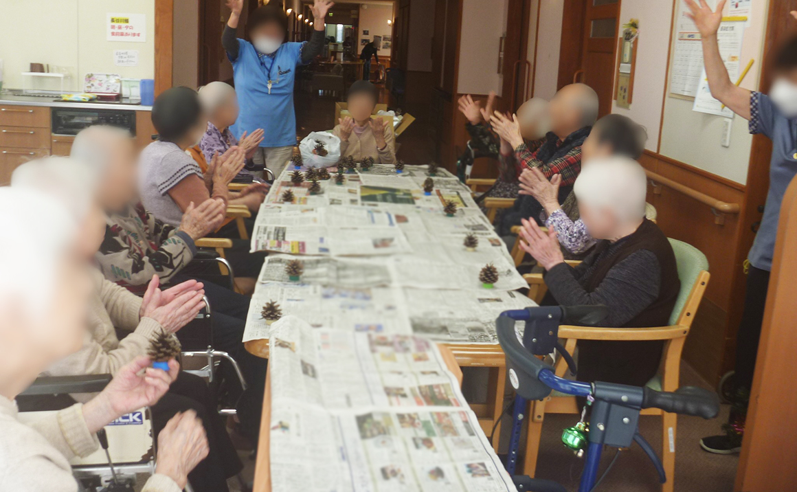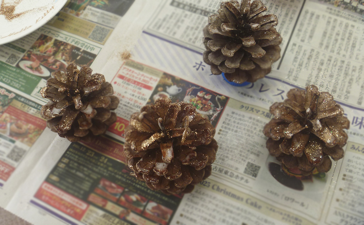 12月1日 暦も変わり今年も後ひと月となりました。 年内最後のイベント、クリスマスに向けてスタッフが松ぼっくりを たくさん持ってきてくれました。 まずは松ぼっくりに薄めたのりを付けラメを振りかけます。 皆様楽しそうに「こんな感じでいいかなぁ」と話もはずんでいました これからクリスマスに向けて少しずつ松ぼっくりのミニツリーを完成する予定です