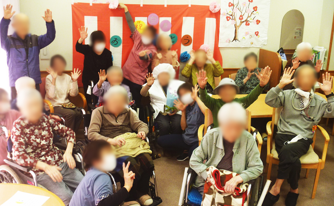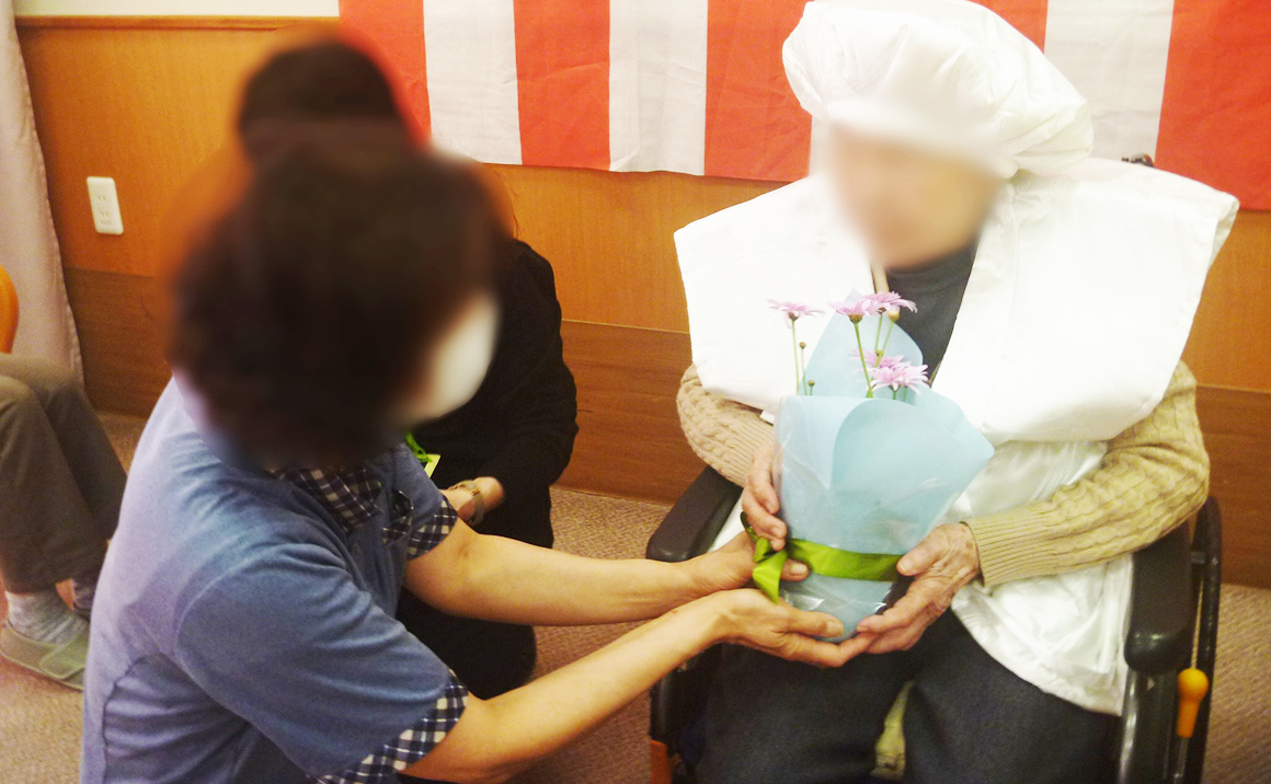 施設で99歳、白寿の方のお祝いをしました。 白い帽子にちゃんちゃんこを着ていただき お祝いの花とメッセージを書いた色紙をプレゼントしました。 集まってくださった入居者様とスタッフからも「おめでとうございます」 と声をかけられその度に「ありがとう、ありがとう」と繰り返し言われました。 本当に長い人生つらいことも楽しいこともあったでしょうね これからもお健やかに施設で過ごしていただきたいと願っております。