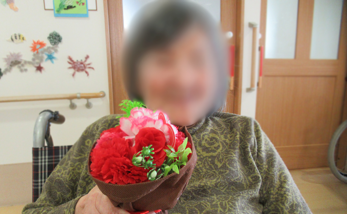 5月11日にたのしい家四条畷でも母の日のイベントを行いました。 女性の入居者の皆様を中心にお花と写真を撮らせて頂いたきました。 また皆様のお母様について思い出を話して頂いたりしました。「優しい人だったよ」等とお話しされる方もおられました。 おやつにはイチゴをはじめとしたデザートを召し上がって頂きました。