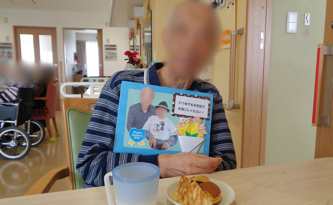 6月15日にたのしい家四条畷にて父の日のイベントを行いました。 男性の入居者の皆様を中心にお写真を撮らせて頂いたきました。 また母の日にはお母様についてお尋ねしたように、今回は皆様のお父様についての思い出を話して頂いたりしました。 おやつにはどら焼きなどのデザートを召し上がって頂きました。
