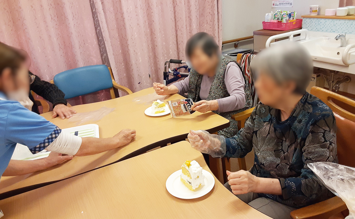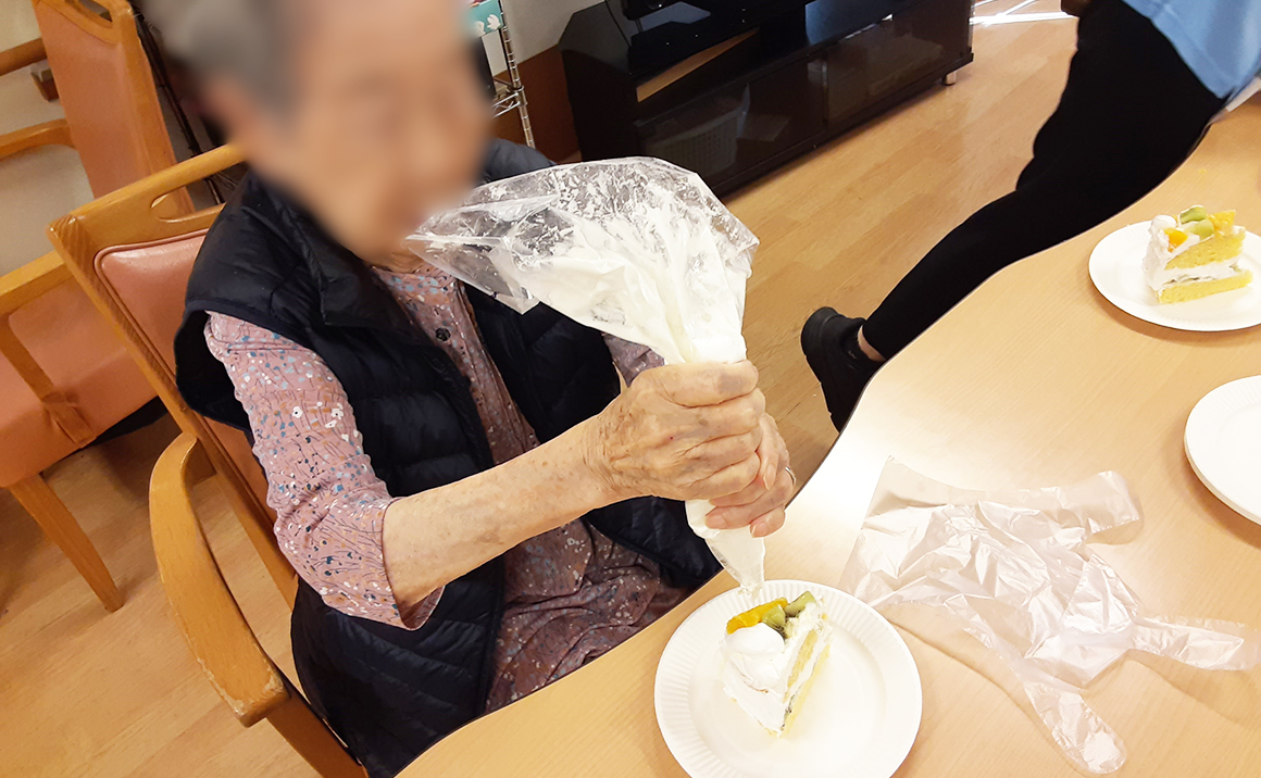 たのしい家名古屋南のケーキ教室の時間です。 料理上手なスタッフがフライパンでケーキの生地を作りました。 皆様に生クリームを泡立てていただいて、たっぷりスポンジに塗って、フルーツ乗せたら 立派なホールケーキが出来ました。 男性ご入居者様と女性スタッフでケーキカット入刀~~♬ 切り分けたケーキは各々で追い生クリームとカラースプレーでデコって完成でーす。 楽しく、美味しくいただきました🍰
