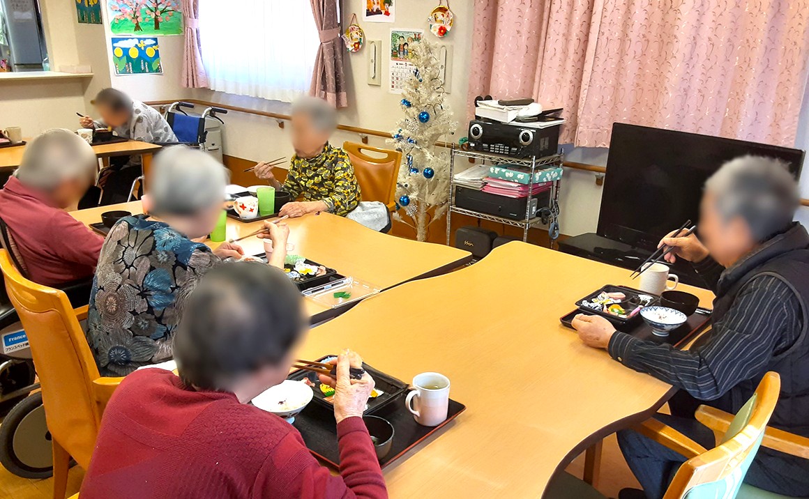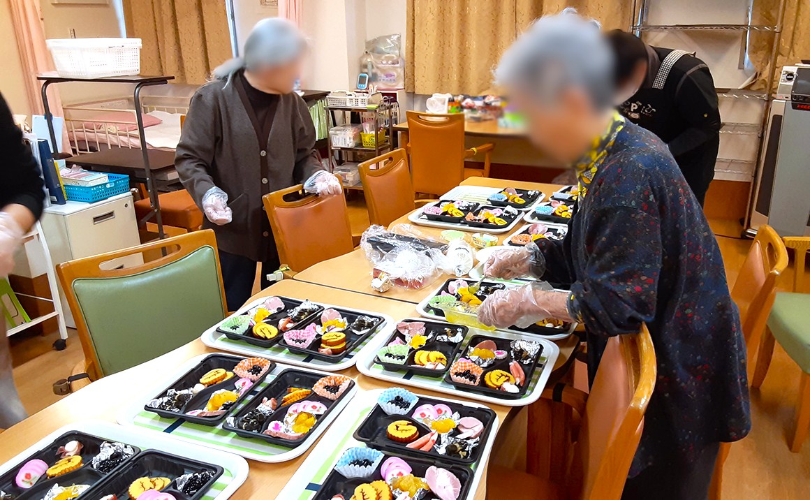 あけましておめでとうございます! ご利用者様と共にお節料理の盛り付けをしました。 9品目の配置を考えながら,量も平等になるように上手に盛り付けてくれました。 お吸い物の浮身はプランターのネギと小松菜を収穫していただきました。 お節でご利益がありますように。