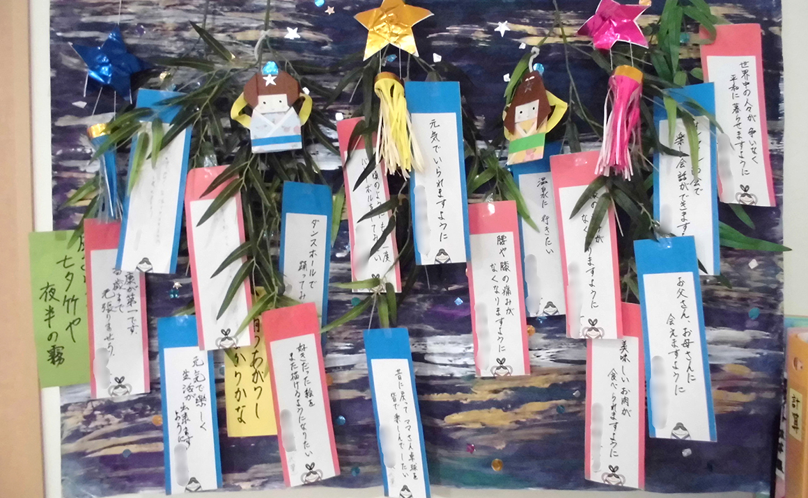 七夕の日には、入居者様に願いごとを短冊に書いていただき、笹に飾りました。