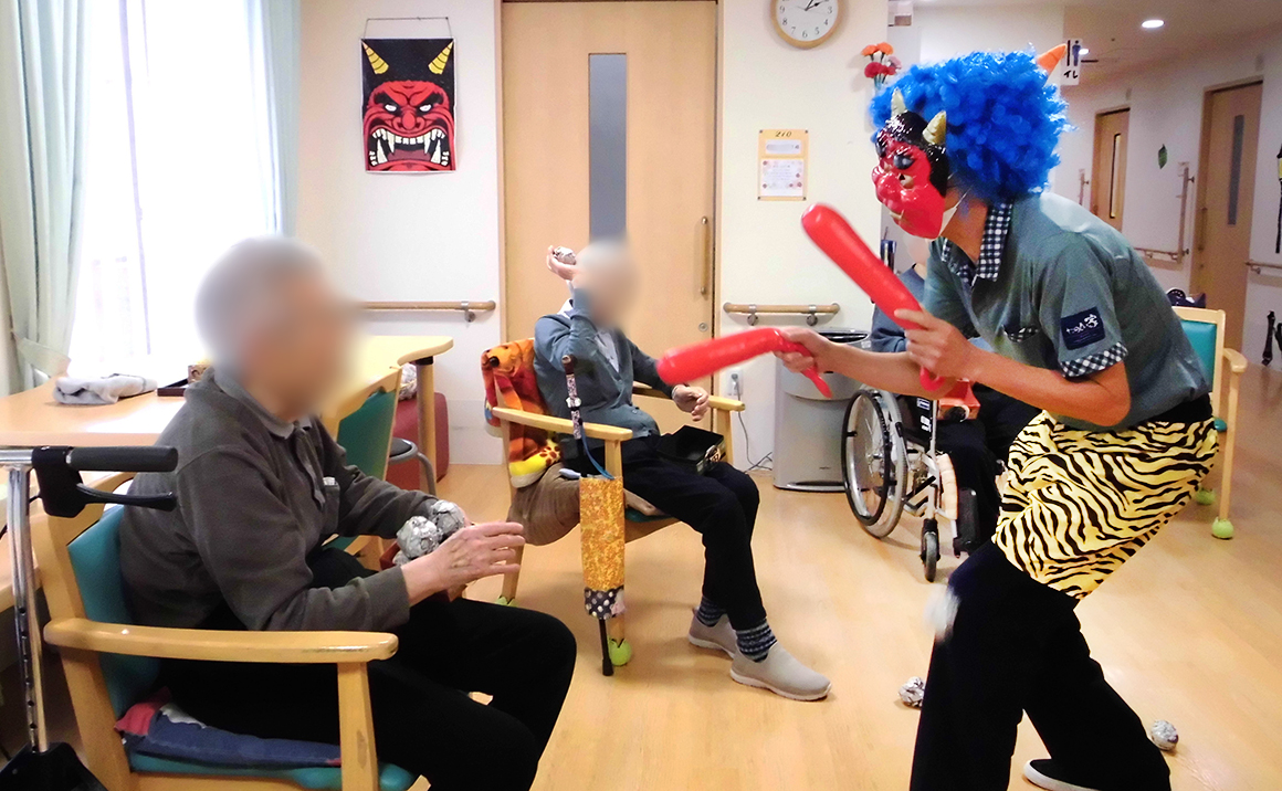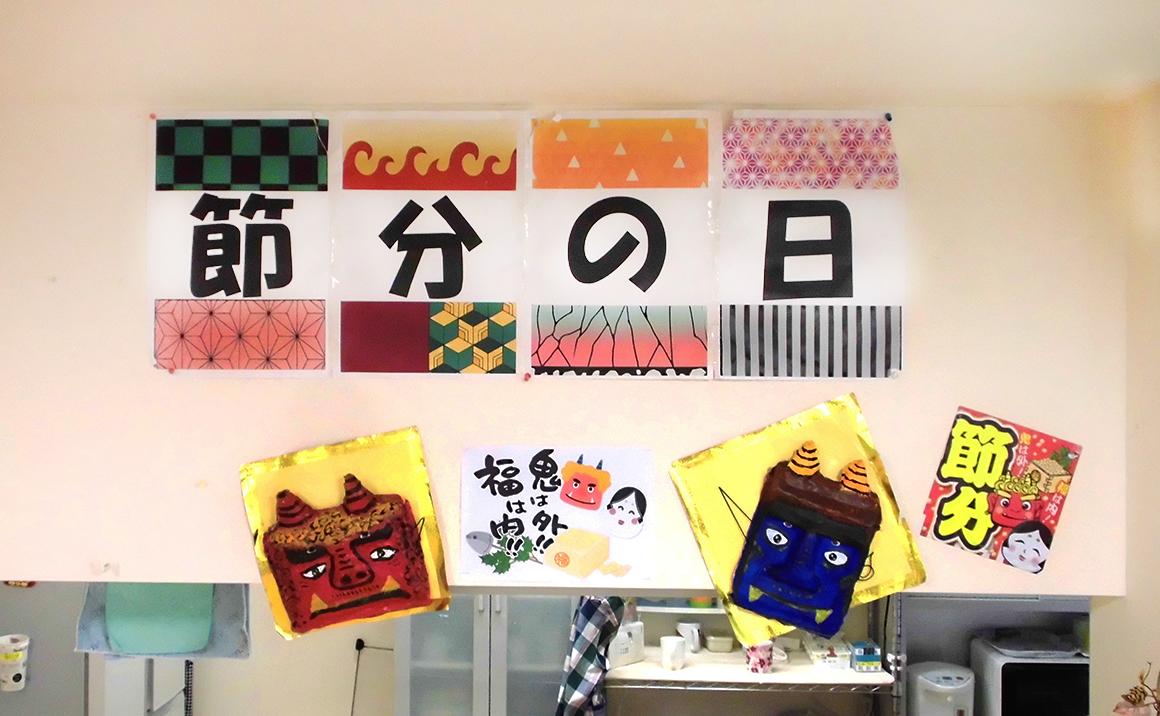 2月は節分の行事を行い、豆に見立てた新聞紙を投げて鬼退治を楽しんでいただきました。 皆様笑顔で節分の雰囲気を味わわれ、賑やかな時間の中で季節を感じるひとときとなりました。 行事の後はケーキを囲み、ほっとひと息つきながらゆったりとした時間を過ごしていただきました。