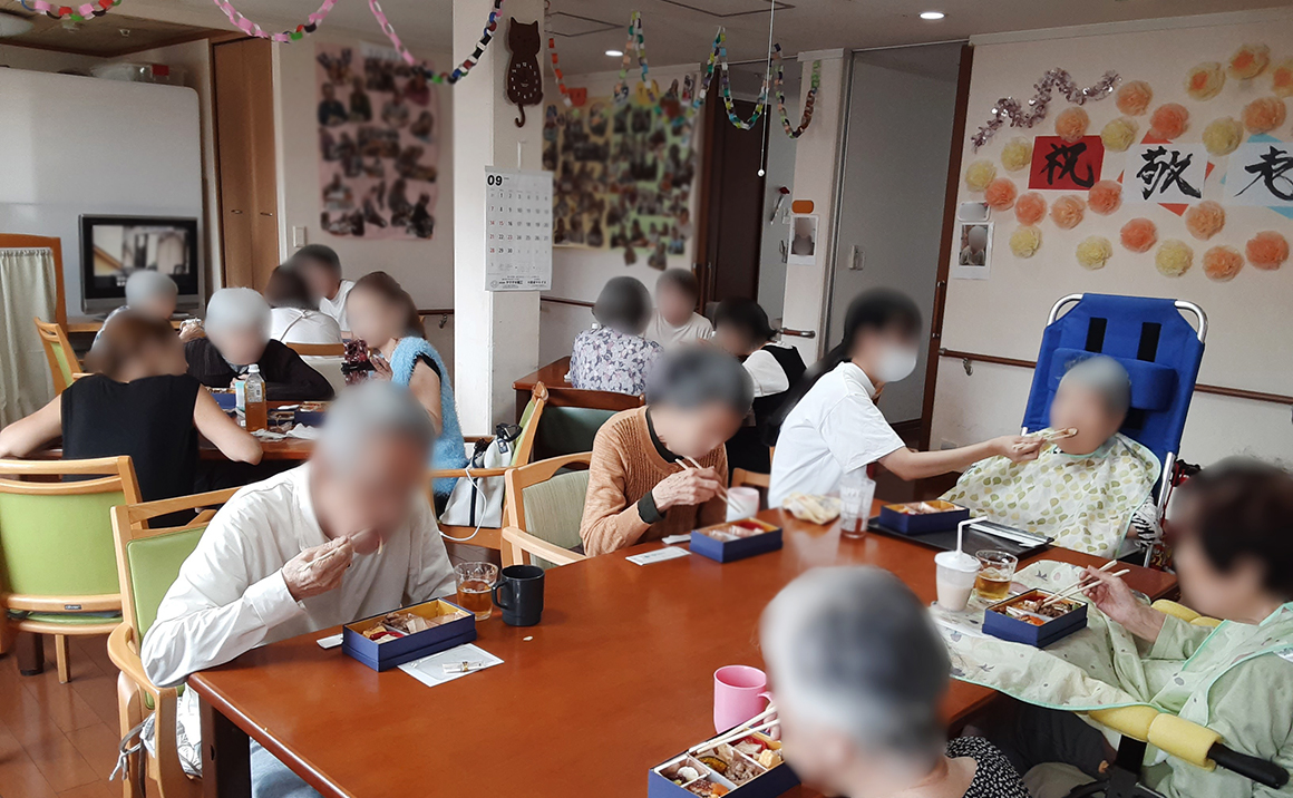2025年9月のイベント報告 9月14日に敬老会を開催しました。 利用者様のご家族様にも、ご参加頂き一緒に昼食を召し上がって頂きました。 施設からのプレゼントも準備し、お渡しさせて頂きました! プレゼントをお渡しした時の、ご利用者様の嬉しそうな笑顔が、とても印象的で嬉しい限りです❣