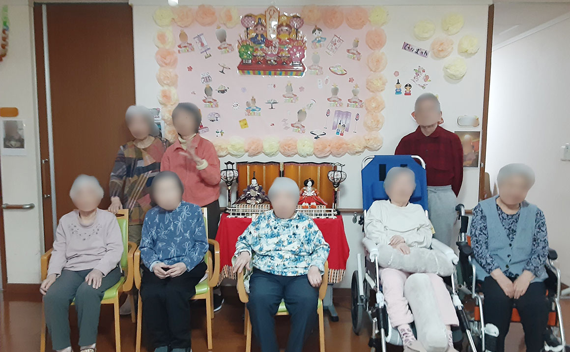 また、雛祭りの壁画は各フロアで入居者様と一緒に作成しました。 ひな人形の前で全員で記念撮影もしました。