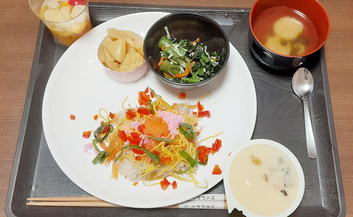 2026年3月 3月は雛祭りイベントを行いました。 昼食は豪華にちらし寿司、おやつはケーキを召し上がりました。
