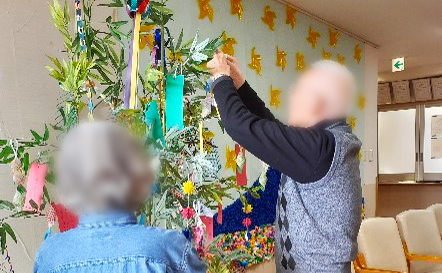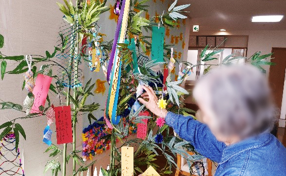 プレザンメゾン足立東伊興では毎年「七夕イベント」を行なっています。 今年はお天気もよかったので、きっと織姫と彦星は会えたことでしょう。 ご入居者様はそれぞれ願い事を考えて、短冊に書かれていました。 笹につけるお飾りも一緒に作成して飾りました。 皆様の願い事が叶いますように。