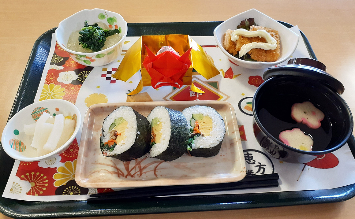 こんにちは。 2/3施設行事で節分・豆まきを行いました。 入居者様に豆をお渡し、お福さん、鬼が登場すると掛け声に合わせて豆を投げました。 ご入居者様の中には、立ち上がって大きく手を振って投げておりました。 昼食では、恵方巻を食べやすいサイズにして提供させて頂きました。 赤鬼さん、お疲れ様でした★