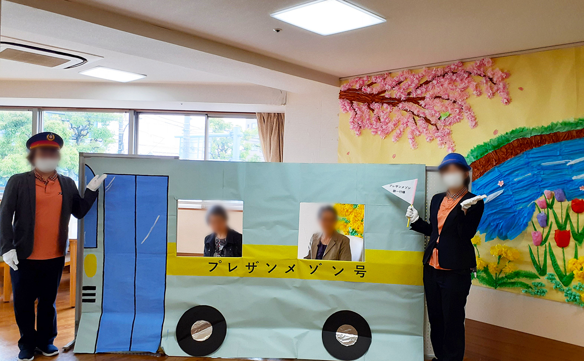 全員で『春の小川』も一緒に歌い、 最後にバスのパネルにご乗車していただき 運転手とバスガイドに扮したスタッフと写真を撮りました。