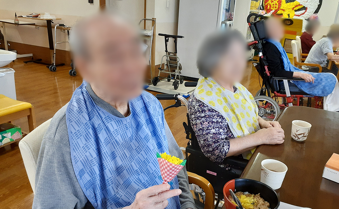 そして食事と一緒に、スタッフが一つひとつ感謝の想いを込めて手作りした、黄色いバラのブーケをプレゼントしました♪ 本物のようだと喜んでくださり、中にはブーケを胸ポケットに大切にしまって持ち帰る方もいて、その姿に私たちスタッフも胸があたたかくなりました。 お父様方、いつもありがとうございます!