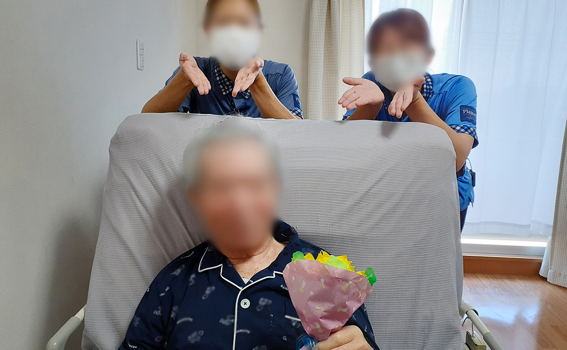 特製の大きな黄色いバラの花束を手に持っていただき、女性スタッフに挟まれお一人ずつの撮影もしました!