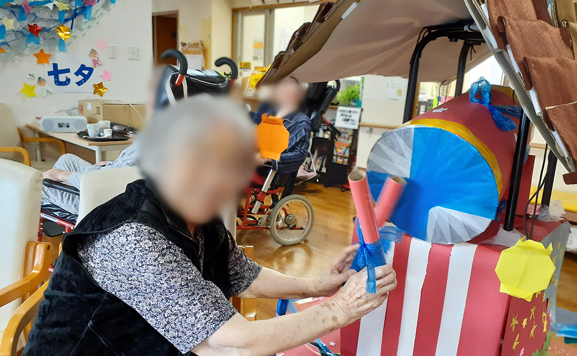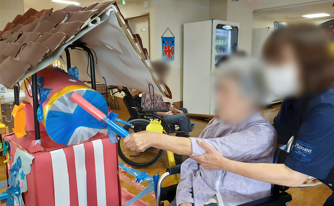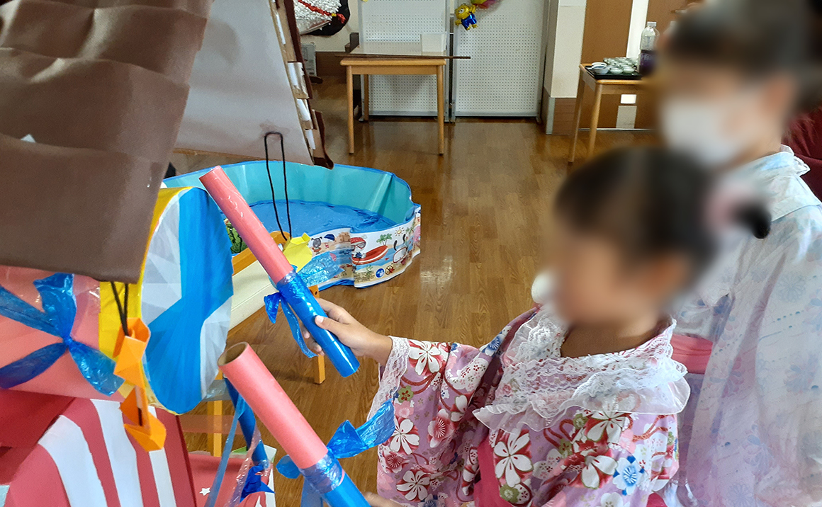 今年は実習で来ていた大学生が作ってくれた、太鼓やぐらがお出迎え! 太鼓を叩くと手作りとは思えないほどの良い音が鳴り響き、皆さま夢中で叩かれていました。 スタッフのお子さんも遊びに来て、一緒に太鼓を叩いて楽しんでいました♪