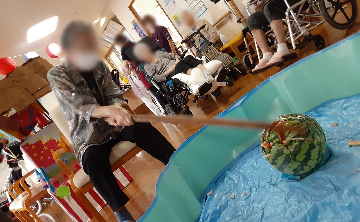 太鼓を叩いたら、次はスイカ割り! 長い竹刀を一生懸命振り下ろし、少しずつ割れていく様子に、周りからは歓声が上がっていました!