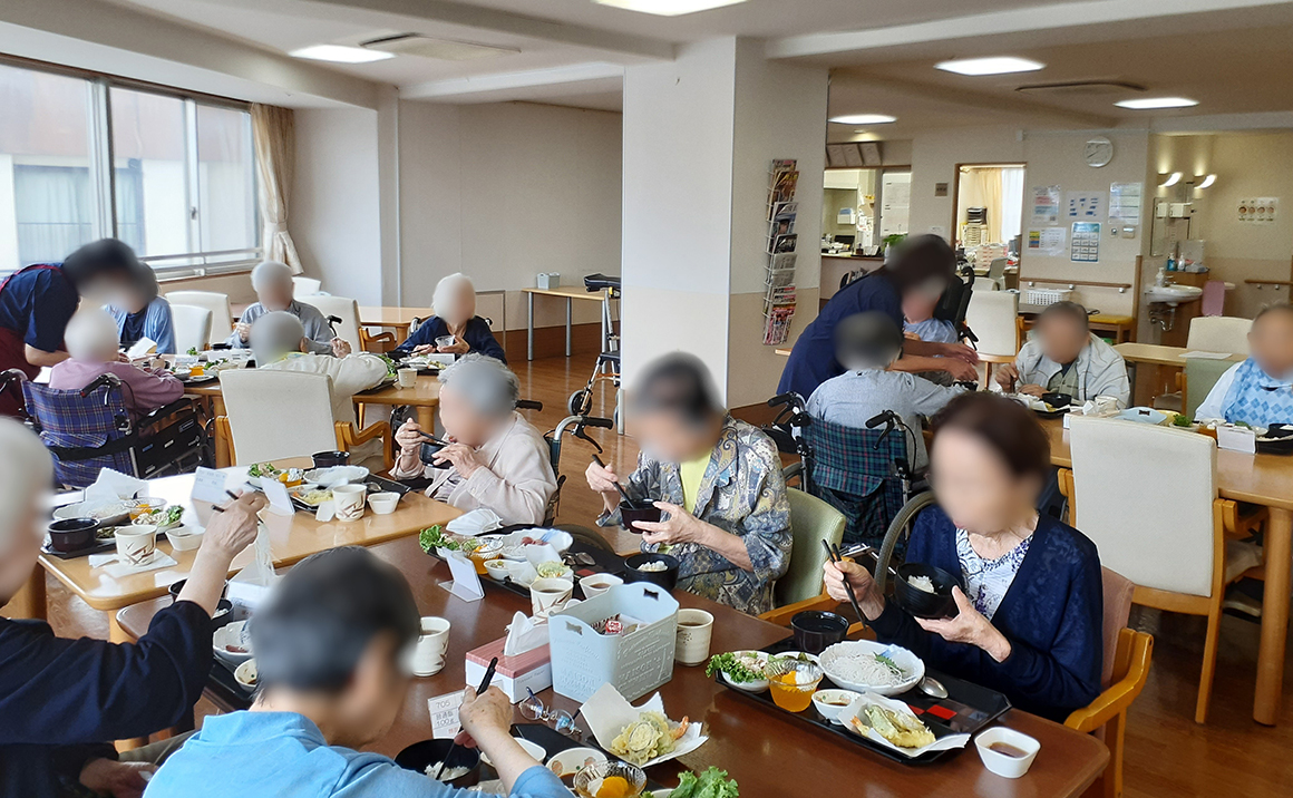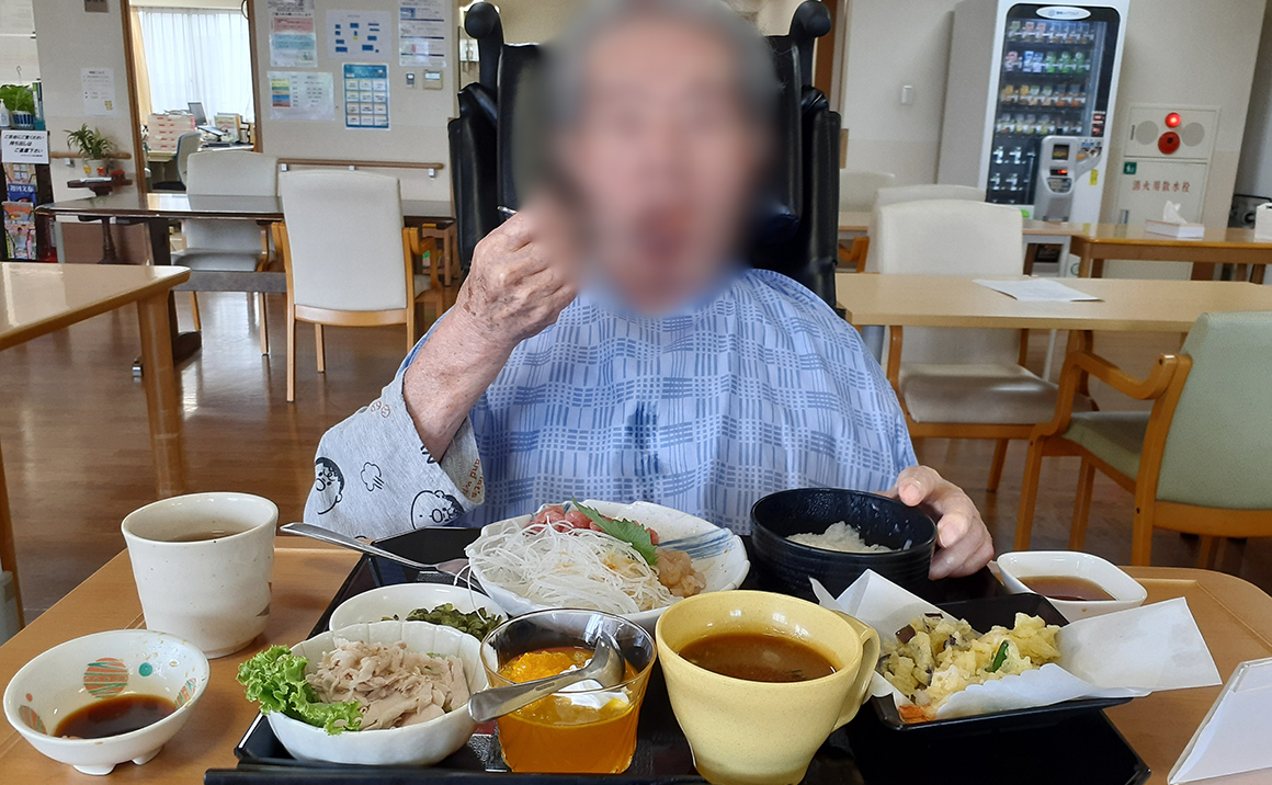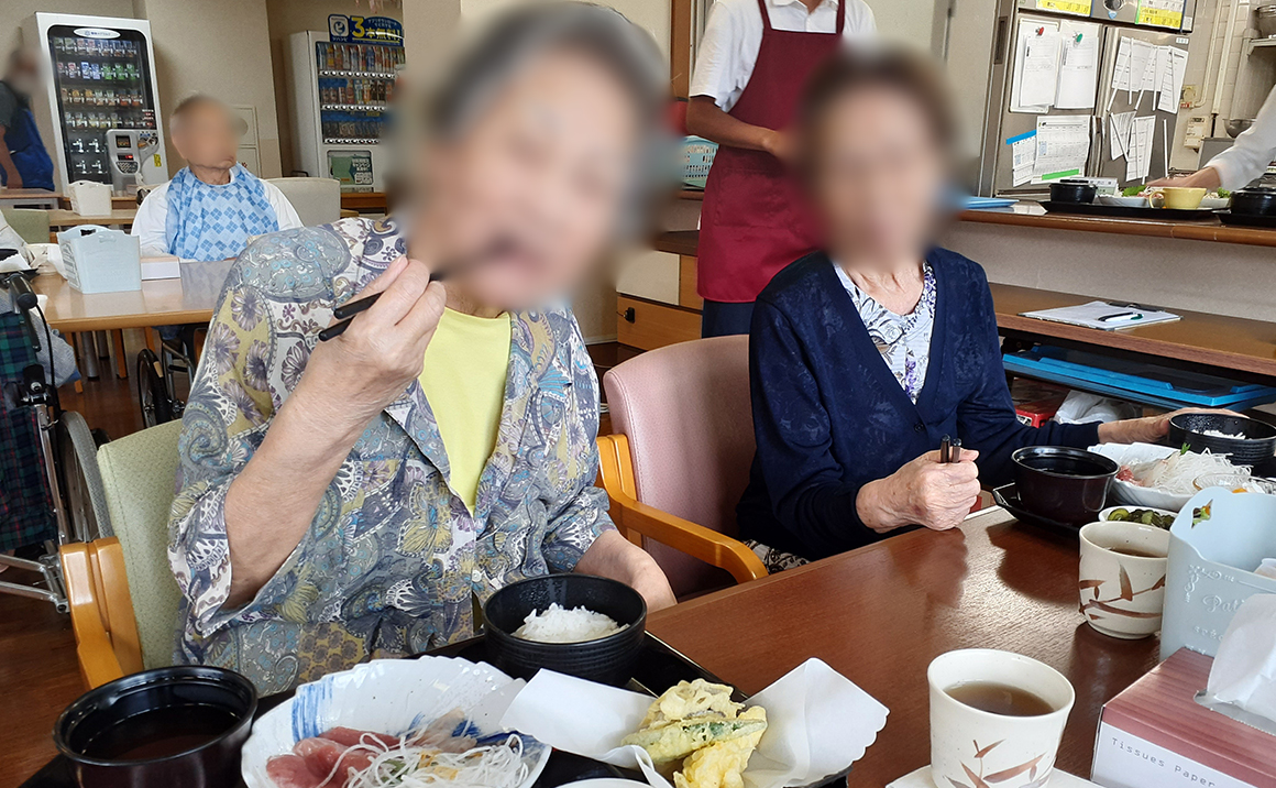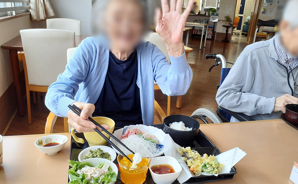 お刺身は入居者様に大人気です! マハタの旬は春から夏といわれており一般の鮮魚店ではお目にかかれない高級魚です。 透明感のある上品な甘みでこりこり触感が特徴です。 併せて人気のある本マグロのお刺身もご用意しました。 皆様残さず召し上がって下さいました。