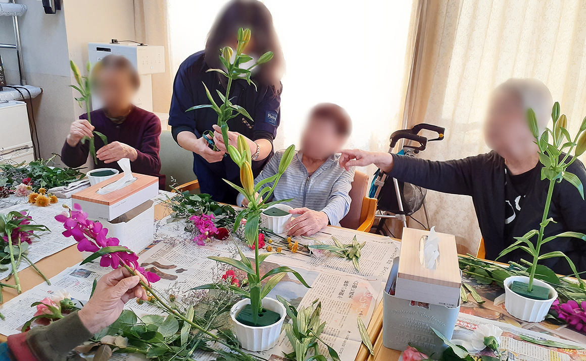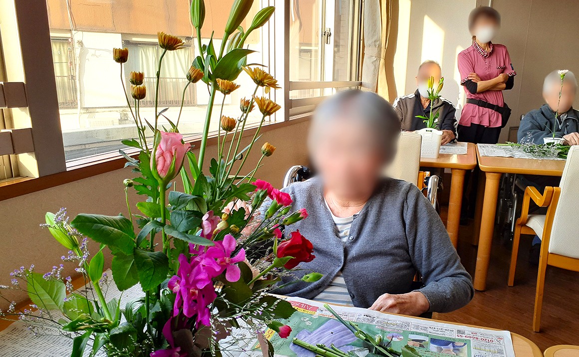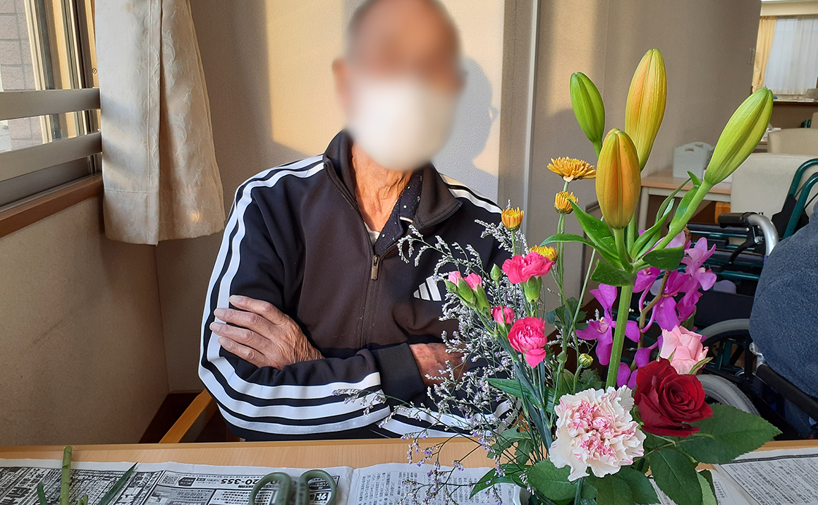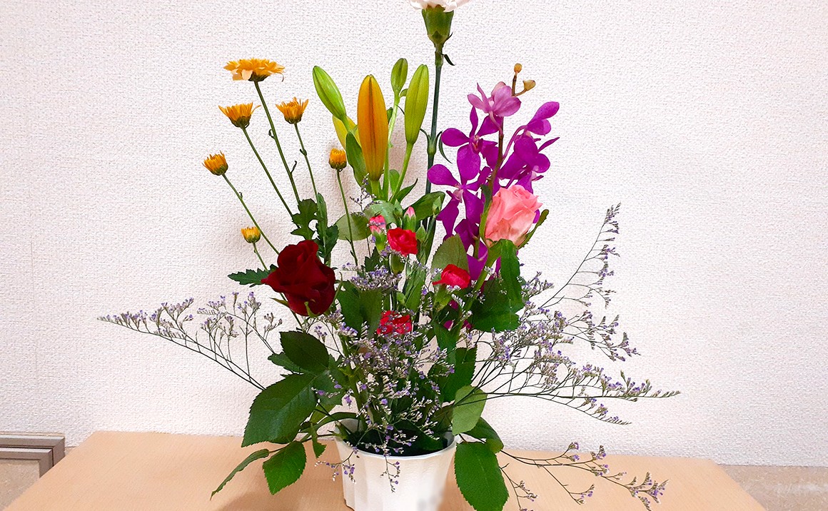 大きなユリとバラやカーネーションが見事です。 男性だってお花を愛でるも参加され皆様楽しまれました。 先生からお花の説明をうけ皆様関心されていました。 「お部屋にお花があるのはいいわねー」と皆様からお喜びの声を頂いております。