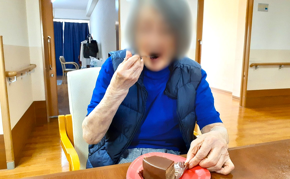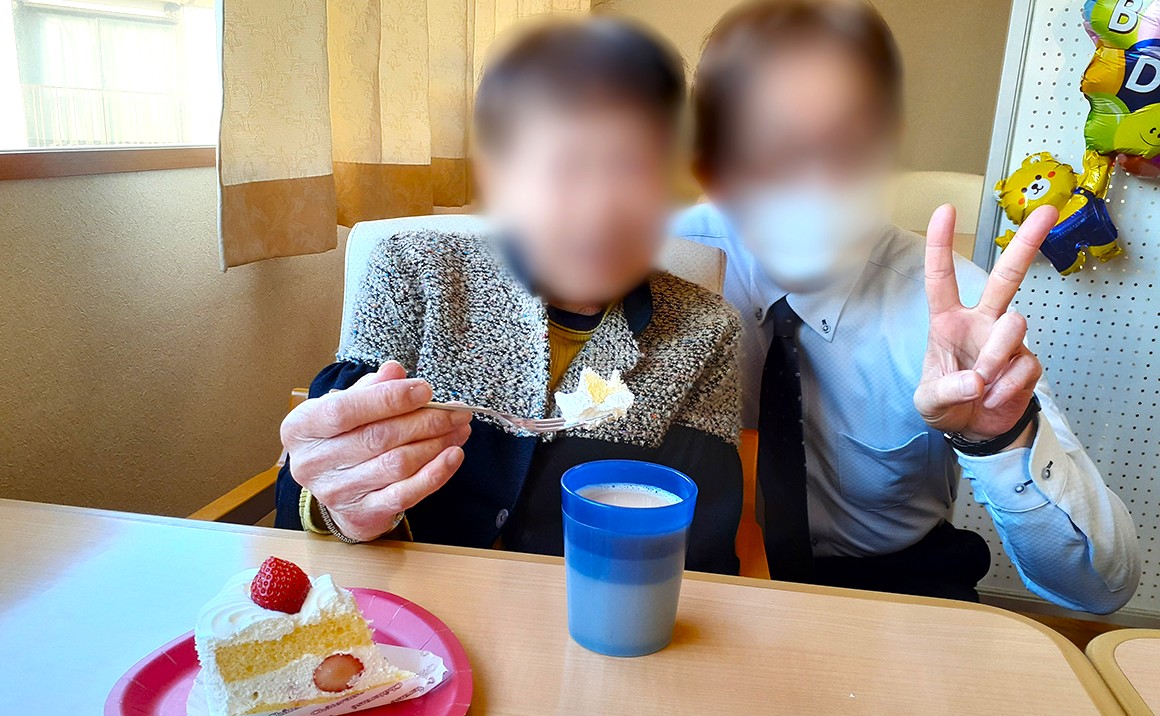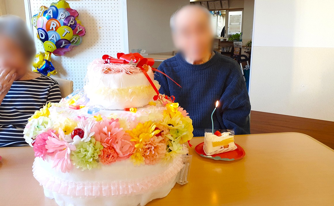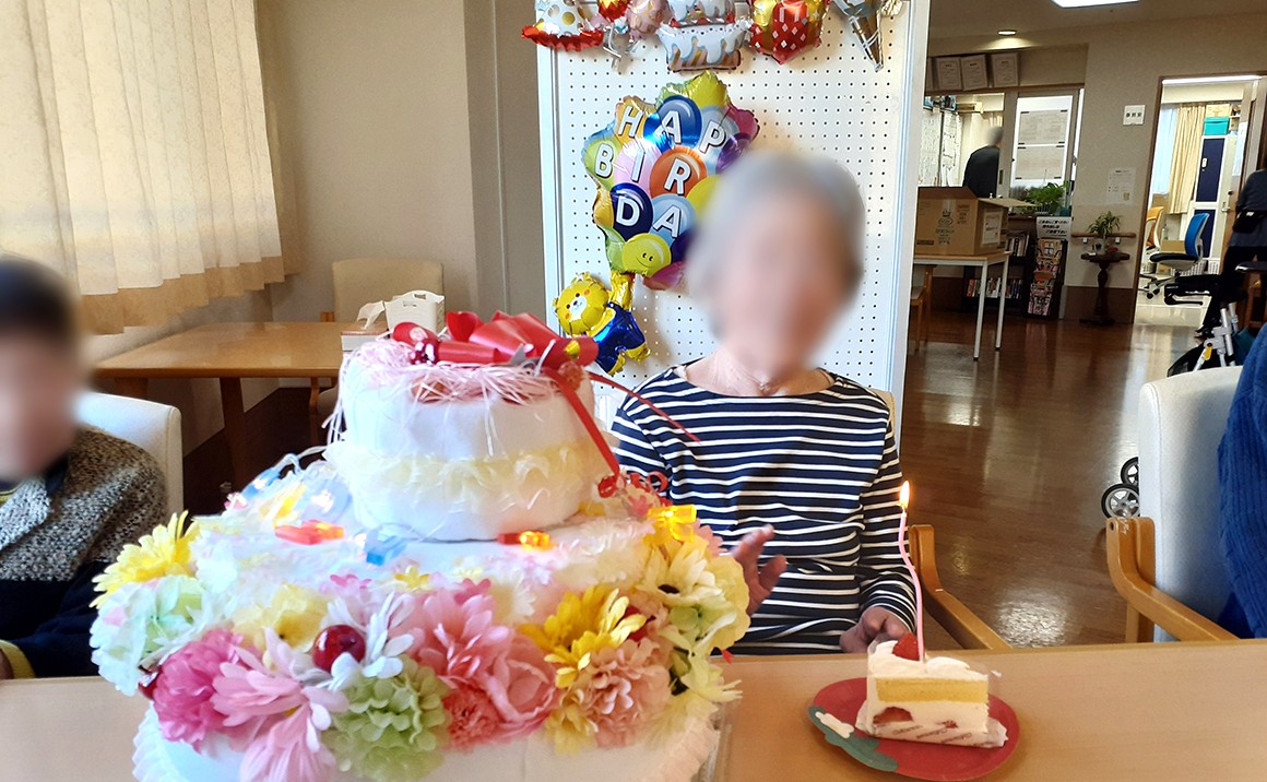 今月のお誕生日会も、職員と一緒にお祝いしました! ケーキを目の前にとても嬉しそうにして下さっています。