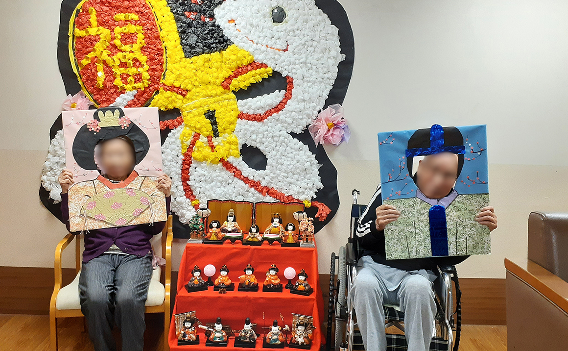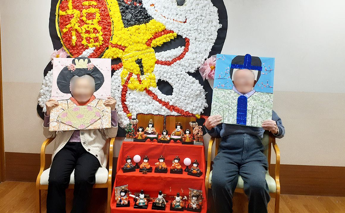 職員手作りの顔抜きパネルでお内裏様とお雛様美♪ 可愛いお雛様と一緒に笑顔で~はい!チース♪ 皆様はお内裏様とお雛様に変身!!