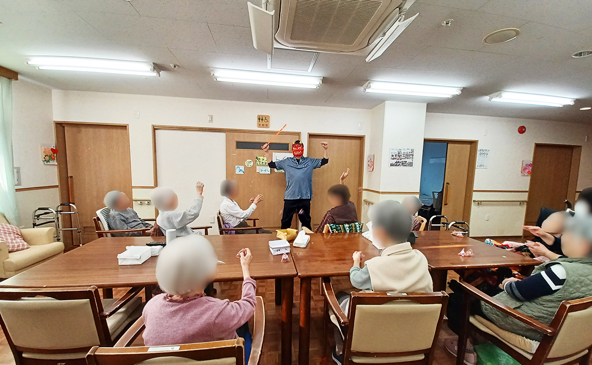 また、午後には、スタッフが扮装した鬼に向かって「鬼は~外!」「福は~内!」と元気いっぱいに豆まきを行われていました。