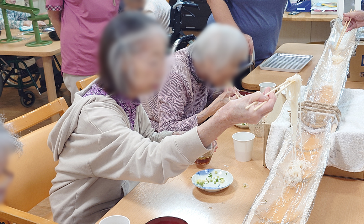 たのしい家上板橋では7月7日の七夕に頂いた竹を使い、流しそうめん台を作成。 施設で流しそうめんを行いました。 普段あまり召し上がらない方も「食べ過ぎちゃった」と楽しんでくださいました 念のため、普段の食事量の1.5倍程度用意しましたがまさかの足りない事態に… 改めて「楽しむ事」が大切であると認識することが出来ました。