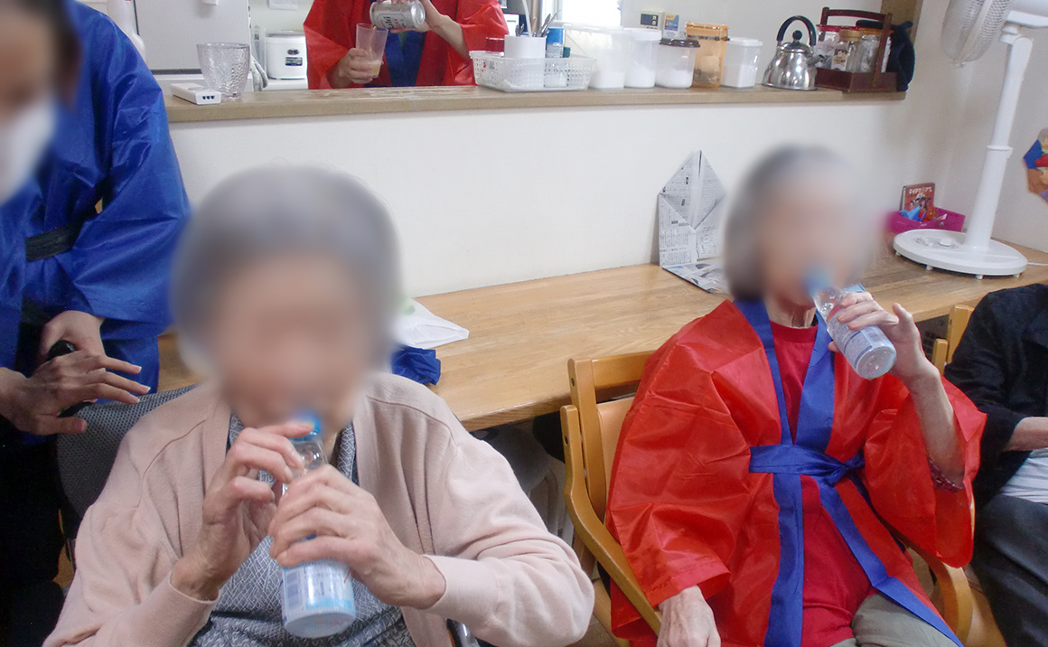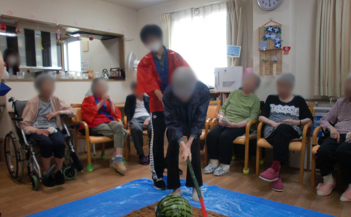8月のたのしい家上板橋では、夏祭りを開催しました。 まずは輪投げ、輪の中に景品が入れば獲得です。 欲しい景品を真剣に狙い、笑いあり、涙ありでした。 スイカ割りでは、剣道の有段者もいましたがなかなか割ることできませんでした。 スイカが割れた時は拍手喝采!その後、美味しくいただきました。 最後は昔懐かしいビー玉ラムネでクルーダウンして、大盛況の中、夏祭りを閉幕しました。 まだまだ暑い日が続きますが、残暑を乗り越え、元気に過ごせるよう取り組んでまいります。
